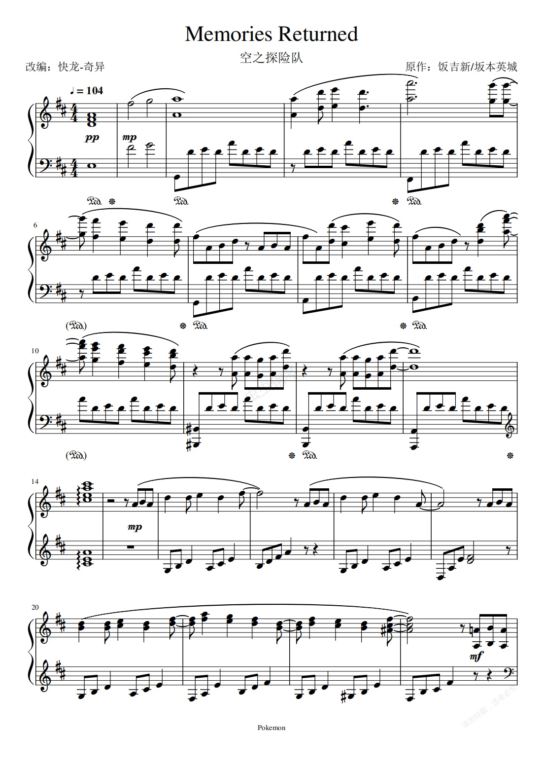 钢琴谱:Memories Returned 宝可梦不可思议的迷宫-空之探险队