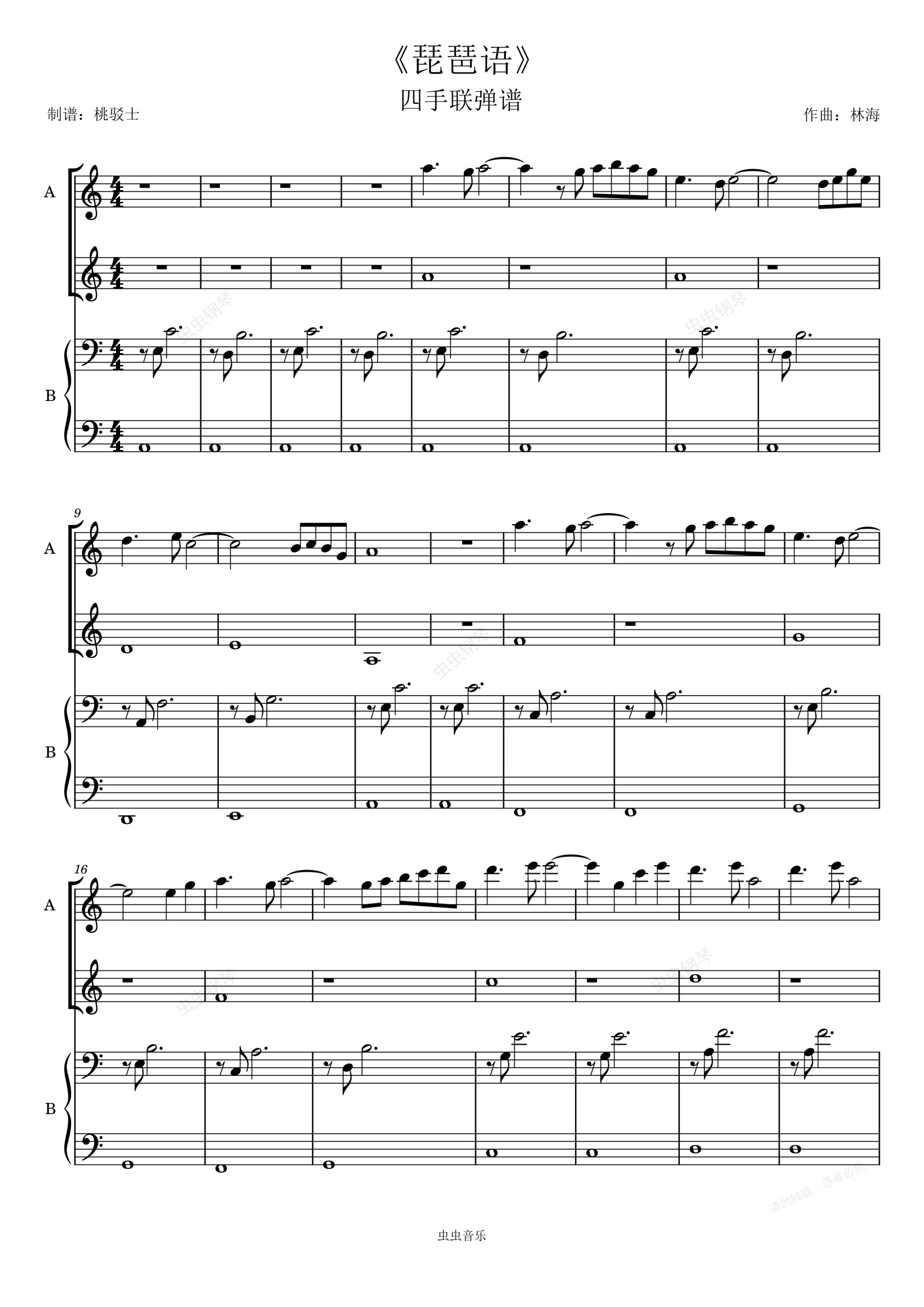钢琴谱:《琵琶语》超简易四手联弹 完美C调