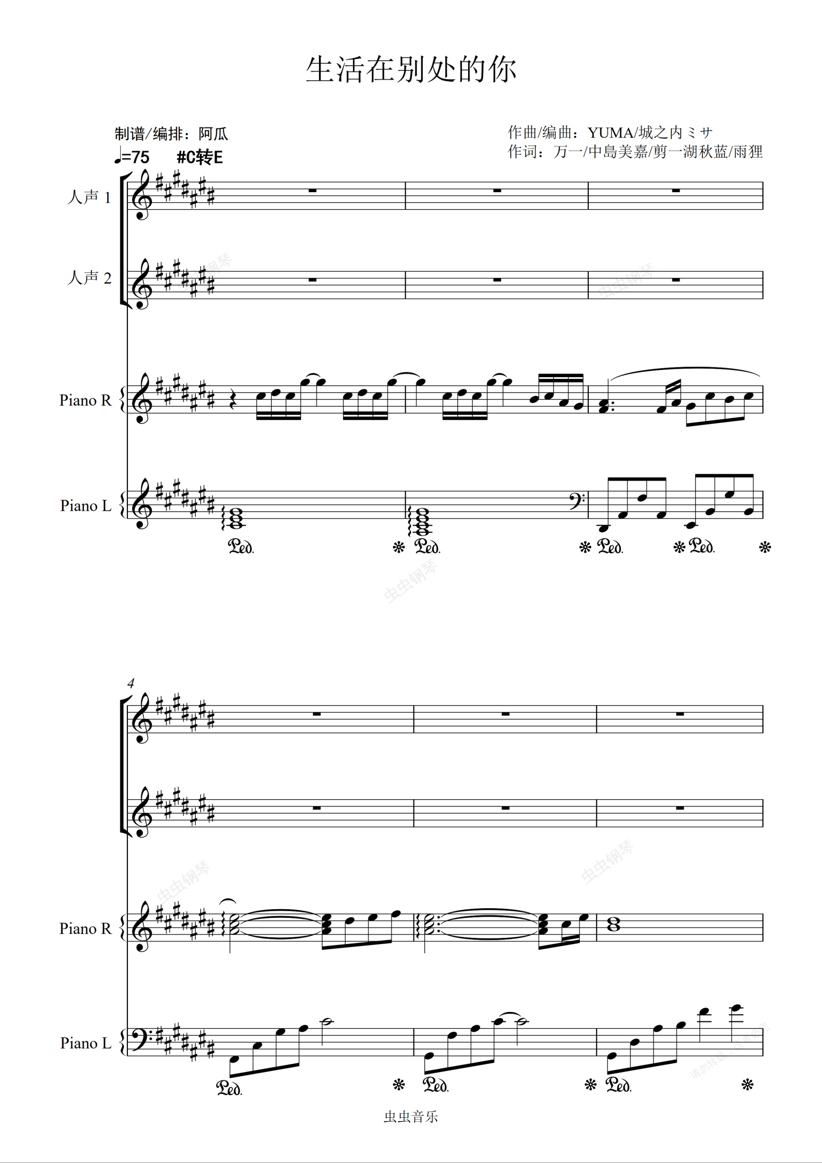 钢琴谱:生活在别处的你 #C转E 原调 精编弹唱版