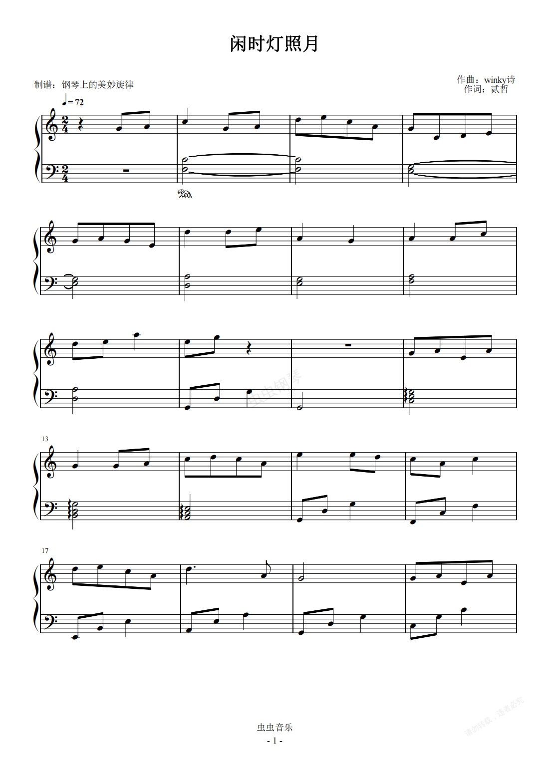钢琴谱:闲时灯照月 C调简易版 [winky诗]赵景旭