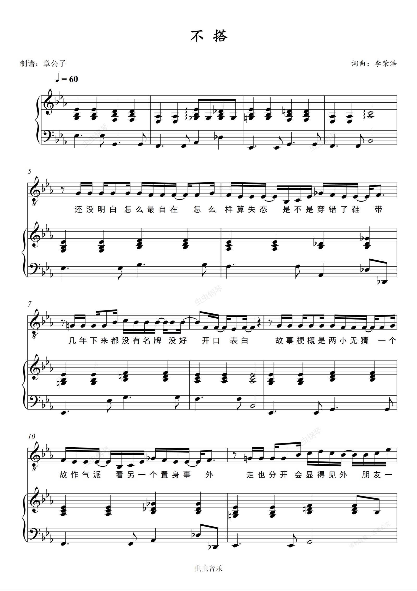 钢琴谱:《不搭》(李荣浩) 弹唱(伴奏)谱