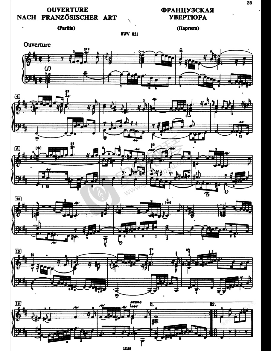 法国风格序曲 in Style BWV 831 序曲 ,指在歌剧、清唱剧、戏剧配乐等的开场音乐,常作为单独的音乐会演奏。十七世纪,序曲在意大利和法国得到发展。当时序曲曲式定为的快-慢-快的三段体,通称为“意大利序曲”。而曲式为慢-快-慢的序曲,则被称为“法国序曲”。 巴赫的《法国风格序曲》 in Style BWV 831 ,实际上是一部《b小调帕蒂塔》 in b Minor,常被称为“第七帕蒂塔”,于1735年出版。共有八个部分组成。 1. 序曲 2. 库朗舞曲 3. 两首加沃特舞曲 I & II 4. 两首帕斯比叶舞曲 I & II 5. 萨拉班德舞曲 6. 两首布列舞曲 I & II 7. 基格舞曲 Gigue 8. 余韵 Echo