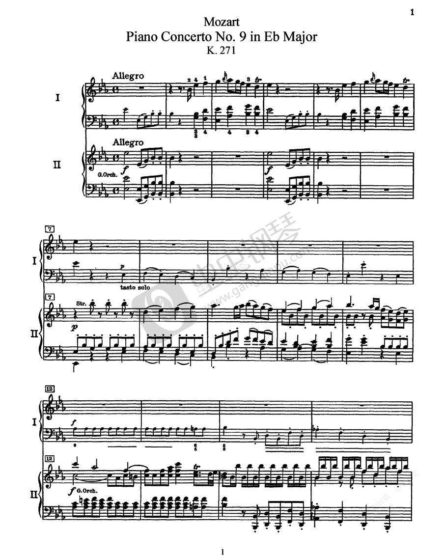 莫扎特的《钢琴协奏曲》Piano 简介    毫无疑问,在所有的乐器中,莫扎特对钢琴最为钟爱,他也为钢琴作了大量的乐曲。在这其中,二十七首钢琴协奏曲的创作贯穿了他的一生,从他11岁创作的第一首钢琴协奏曲(K.37,F大调,1767年)到他辞世那年的最后一首(K.595,降B大调,1791年),记录着莫扎特在音乐上的成长轨迹:由早期的改编模仿到逐步探索,到最终形成独一无二的莫扎特风格。在钢琴协奏曲的历史上,是莫扎特采用交响手法使独奏同乐队齐奏保持平衡,并且把戏剧性的对比和歌唱性的技艺结合在一起。莫扎特的钢琴协奏曲是其器乐协奏曲的精华,齐奏声部和独奏声部的和谐平衡达到完美的境界。像他的其他体裁的作品一样,虽无激烈紧张的矛盾冲突,但却充满了戏剧性的对比、出人意料的转换、不同感情的对照。无论在艺术反映速度的敏捷上,还是在骤然产生的意境的明确以及急剧转换的形象的清晰上,他的钢琴协奏曲都是十八世纪即兴表演艺术的精华所在。      在莫扎特的二十七首钢琴协奏曲中,早期的协奏曲只是把过去作曲家的钢琴奏鸣曲改编成独奏和乐队齐奏的作品,直到1773年才创作出一首比较有独立意义的钢琴协奏曲(K.175)第五首,D大调。但即使在他改编的作品中,我们也能领略到他后来的某些风采。      他的头四首钢琴协奏曲,乐谱中已有了管乐器的相当地位,特别是木管乐器和钢琴的应和,暗示了莫扎特成熟协奏曲中大放异彩的先声。例如圆号在首乐章的应答句,令人想起后世德奥交响乐中萦绕不去的森林情结。总之,你很容易把它们和巴赫或海顿的协奏曲区分开来。      他的《降E大调第九钢琴协奏曲》K.271 (1777年) 是他早期协奏曲中最独特的一首。首乐章没有通常长长的引子,乐队刚奏出一个半小节,钢琴就抢进来续出它的下句;乐队又叠住钢琴句尾,重申它的起始句,却又再一次被钢琴打断。你来我往,一上来就是对抗,如此奇险,却又如此奇妙。慢乐章又是一个奇迹,反差之大,对比之强烈,令人吃惊。这也是莫扎特钢琴协奏曲中首次用小调写的乐章。加了弱音器的两组小提琴交织成晦暗、悲凉的背景旋律,钢琴从中发展出一个优美之极的独奏长句,宁静而略带伤感。当小调的乐队主题又转回来时,田野的上空又被阴云遮蔽,而钢琴奏出的甜美曲调,听起来成了一首悲歌,令人倍觉伤感。      与他的小提琴协奏曲的创作不同,莫扎特所有重要的钢琴协奏曲都是他维也纳时期的作品,也许钢琴协奏曲所需要的交响意识直到维也纳时期才真正建立起来。从第十一首(K.413,F大调,1782年)起,一个向着他的成熟期的飞跃出现在其音符中了。此时的莫扎特,刚刚摆脱萨尔斯堡大主教的束缚,来到维也纳,决心作一个前人从未有过的、独立自主的音乐家。因此,第十一钢琴协奏曲起头那句著名的旋律,自信而又倔强,正是他那时心境的写照。与之对比的第二主题是那么风流、洒脱。在抒情的慢乐章里,美丽动人的歌唱旋律,恍若天上仙乐飘飘。    1784年是莫扎特的创作丰收年。在这一年,莫扎特写了六部钢琴协奏曲:      降E大调第14首(K.449)    降B大调第15首(K.450)    D大调第16首(K.451)    G大调第17首(K.453)    降B大调第18首(K.456)    F大调第19首(K.459)。      降E大调第14首(K.449)的独特之处出人意外:一首大调作品的开头竟是如此阴郁、迷茫!在通常总是欢快爽朗的莫扎特音乐中相当少见。    降B大调第15首(K.450)由两支木管领头,雀跃般的顿挫颇具鼓动性,诱使钢琴以华丽的步态翩翩进入。慢乐章是一支犹豫而沉静的歌,以迭句构成的回旋曲末乐章以轻快的音型模仿军号的号角声。    D大调第16首(K.451)的开头也有一股跃跃欲试的强劲动力,吻合生命自身的冲动,同时也让人想起莫扎特曾经有过的、虽然短暂却真正是春风得意的那段岁月。    G大调第17首(K.453)是莫扎特为他所器重的一位学生——芭芭拉•普洛耶所写。乐曲美妙动听,充满发自莫扎特当时心境的愉快、美妙和优雅,或许还有几分体贴。自由而飘忽的慢乐章令人心荡神驰,末乐章的主题用了一个近乎民歌的简单、明朗的曲调,然后是一连串越来越快的变奏,灿烂而热闹。    降B大调第18首(K.456)也体现了莫扎特这个时期意气风发的精神状态,三个乐章贯穿着兴奋、舒畅和鼓舞。    从第十九首(K.459,F大调,1784年)至第二十七首(K.595,降B大调,1791年),代表了他的成熟期,也是最受世人欢迎的作品。这些音乐的表现力丰富多彩,都有与其内容相适应的调性,表现庄严有力的采用C大调,壮丽辉煌的用D大调,清晰和激昂的用F大调,欢乐而刚劲的采用G大调,抒情而明朗的采用A大调,朴实感人的采用降B大调,宏伟堂皇的采用降E大调,只有表现独特的戏剧性构思的时候才采用小调。      在莫扎特的二十七首钢琴协奏曲中,只有两首是用小调写的,即d小调的第二十首(K.466,1785年)及c小调的第二十四首(K.491,1786年),都充满了忧郁和悲伤。尤其是后者。    c小调的第二十四首(K.491,1786)。一开头的乐队引子,听上去有一种痛苦的挣扎感,就像是强忍着眼泪没让它流下来。慢乐章的歌唱旋律首先由钢琴弹出,在几件管乐器的衬托下有了梦境般的甜美,宛如一首忧郁的摇篮曲。最后的“小快板”可以说是莫扎特最伟大、最感人至深的一个乐章。悲伤是很明显的,但在强有力的快速度中展开,使悲伤不再显得柔弱、苍白。铿锵进行中的悲伤,有了坚强人格力量的支撑,更