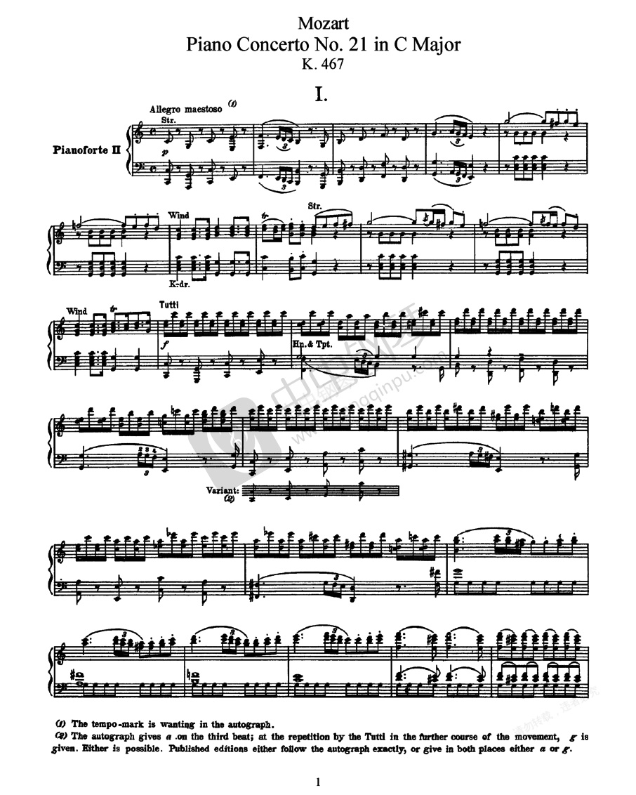 莫扎特的《钢琴协奏曲》Piano 简介 毫无疑问,在所有的乐器中,莫扎特对钢琴最为钟爱,他也为钢琴作了大量的乐曲。在这其中,二十七首钢琴协奏曲的创作贯穿了他的一生,从他11岁创作的第一首钢琴协奏曲(K.37,F大调,1767年)到他辞世那年的最后一首(K.595,降B大调,1791年),记录着莫扎特在音乐上的成长轨迹:由早期的改编模仿到逐步探索,到最终形成独一无二的莫扎特风格。在钢琴协奏曲的历史上,是莫扎特采用交响手法使独奏同乐队齐奏保持平衡,并且把戏剧性的对比和歌唱性的技艺结合在一起。莫扎特的钢琴协奏曲是其器乐协奏曲的精华,齐奏声部和独奏声部的和谐平衡达到完美的境界。像他的其他体裁的作品一样,虽无激烈紧张的矛盾冲突,但却充满了戏剧性的对比、出人意料的转换、不同感情的对照。无论在艺术反映速度的敏捷上,还是在骤然产生的意境的明确以及急剧转换的形象的清晰上,他的钢琴协奏曲都是十八世纪即兴表演艺术的精华所在。 在莫扎特的二十七首钢琴协奏曲中,早期的协奏曲只是把过去作曲家的钢琴奏鸣曲改编成独奏和乐队齐奏的作品,直到1773年才创作出一首比较有独立意义的钢琴协奏曲(K.175)第五首,D大调。但即使在他改编的作品中,我们也能领略到他后来的某些风采。 他的头四首钢琴协奏曲,乐谱中已有了管乐器的相当地位,特别是木管乐器和钢琴的应和,暗示了莫扎特成熟协奏曲中大放异彩的先声。例如圆号在首乐章的应答句,令人想起后世德奥交响乐中萦绕不去的森林情结。总之,你很容易把它们和巴赫或海顿的协奏曲区分开来。 他的《降E大调第九钢琴协奏曲》K.271 (1777年) 是他早期协奏曲中最独特的一首。首乐章没有通常长长的引子,乐队刚奏出一个半小节,钢琴就抢进来续出它的下句;乐队又叠住钢琴句尾,重申它的起始句,却又再一次被钢琴打断。你来我往,一上来就是对抗,如此奇险,却又如此奇妙。慢乐章又是一个奇迹,反差之大,对比之强烈,令人吃惊。这也是莫扎特钢琴协奏曲中首次用小调写的乐章。加了弱音器的两组小提琴交织成晦暗、悲凉的背景旋律,钢琴从中发展出一个优美之极的独奏长句,宁静而略带伤感。当小调的乐队主题又转回来时,田野的上空又被阴云遮蔽,而钢琴奏出的甜美曲调,听起来成了一首悲歌,令人倍觉伤感。 与他的小提琴协奏曲的创作不同,莫扎特所有重要的钢琴协奏曲都是他维也纳时期的作品,也许钢琴协奏曲所需要的交响意识直到维也纳时期才真正建立起来。从第十一首(K.413,F大调,1782年)起,一个向着他的成熟期的飞跃出现在其音符中了。此时的莫扎特,刚刚摆脱萨尔斯堡大主教的束缚,来到维也纳,决心作一个前人从未有过的、独立自主的音乐家。因此,第十一钢琴协奏曲起头那句著名的旋律,自信而又倔强,正是他那时心境的写照。与之对比的第二主题是那么风流、洒脱。在抒情的慢乐章里,美丽动人的歌唱旋律,恍若天上仙乐飘飘。 1784年是莫扎特的创作丰收年。在这一年,莫扎特写了六部钢琴协奏曲: 降E大调第14首(K.449) 降B大调第15首(K.450) D大调第16首(K.451) G大调第17首(K.453) 降B大调第18首(K.456) F大调第19首(K.459)。 降E大调第14首(K.449)的独特之处出人意外:一首大调作品的开头竟是如此阴郁、迷茫!在通常总是欢快爽朗的莫扎特音乐中相当少见。 降B大调第15首(K.450)由两支木管领头,雀跃般的顿挫颇具鼓动性,诱使钢琴以华丽的步态翩翩进入。慢乐章是一支犹豫而沉静的歌,以迭句构成的回旋曲末乐章以轻快的音型模仿军号的号角声。 D大调第16首(K.451)的开头也有一股跃跃欲试的强劲动力,吻合生命自身的冲动,同时也让人想起莫扎特曾经有过的、虽然短暂却真正是春风得意的那段岁月。 G大调第17首(K.453)是莫扎特为他所器重的一位学生——芭芭拉•普洛耶所写。乐曲美妙动听,充满发自莫扎特当时心境的愉快、美妙和优雅,或许还有几分体贴。自由而飘忽的慢乐章令人心荡神驰,末乐章的主题用了一个近乎民歌的简单、明朗的曲调,然后是一连串越来越快的变奏,灿烂而热闹。 降B大调第18首(K.456)也体现了莫扎特这个时期意气风发的精神状态,三个乐章贯穿着兴奋、舒畅和鼓舞。 从第十九首(K.459,F大调,1784年)至第二十七首(K.595,降B大调,1791年),代表了他的成熟期,也是最受世人欢迎的作品。这些音乐的表现力丰富多彩,都有与其内容相适应的调性,表现庄严有力的采用C大调,壮丽辉煌的用D大调,清晰和激昂的用F大调,欢乐而刚劲的采用G大调,抒情而明朗的采用A大调,朴实感人的采用降B大调,宏伟堂皇的采用降E大调,只有表现独特的戏剧性构思的时候才采用小调。 在莫扎特的二十七首钢琴协奏曲中,只有两首是用小调写的,即d小调的第二十首(K.466,1785年)及c小调的第二十四首(K.491,1786年),都充满了忧郁和悲伤。尤其是后者。 c小调的第二十四首(K.491,1786)。一开头的乐队引子,听上去有一种痛苦的挣扎感,就像是强忍着眼泪没让它流下来。慢乐章的歌唱旋律首先由钢琴弹出,在几件管乐器的衬托下有了梦境般的甜美,宛如一首忧郁的摇篮曲。最后的“小快板”可以说是莫扎特最伟大、最感人至深的一个乐章。悲伤是很明显的,但在强有力的快速度中展开,使悲伤不再显得柔弱、苍白。铿锵进行中的悲伤,有了坚强人格力量的支撑,更伟大,也更美丽。贝多芬也曾被这个乐章深深感动过。 第