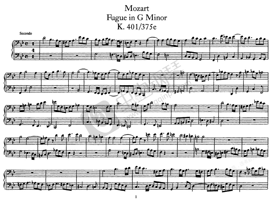钢琴谱:g小调赋格 Fugue in g Minor K.401/375e(Mozart K401 Fugue in g (四手联弹))