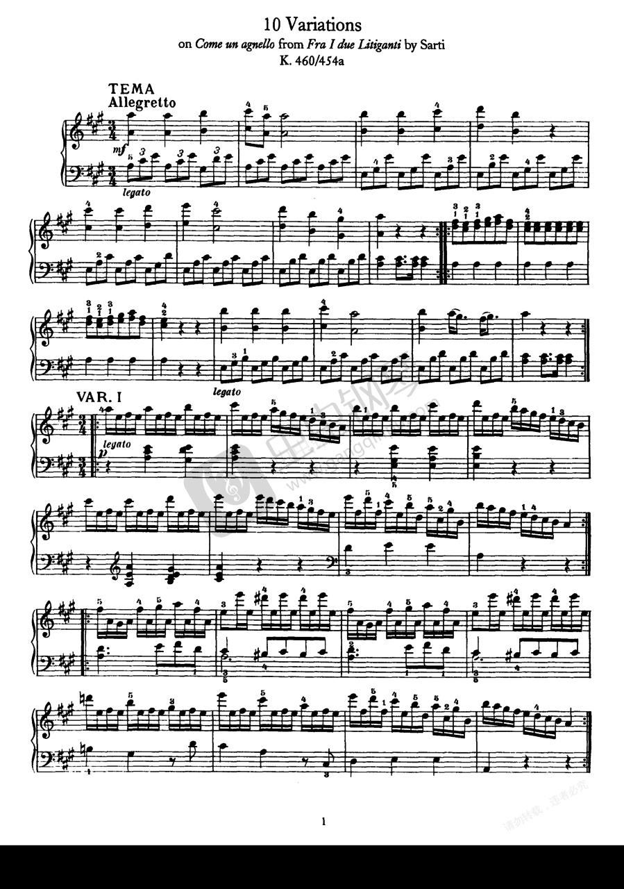 钢琴谱:A大调钢琴变奏曲 K.460/454a