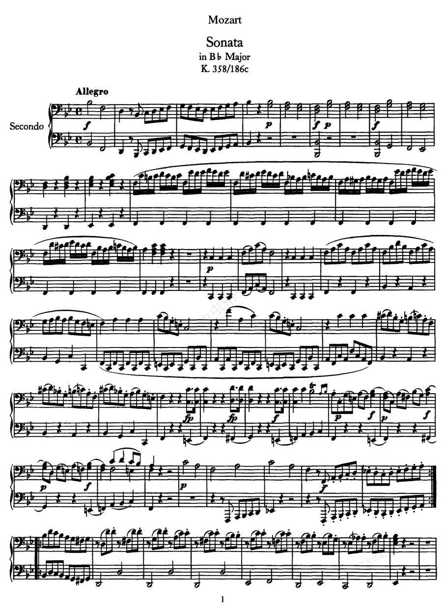 钢琴谱:降B大调钢琴四手联弹奏鸣曲 K.358/186c