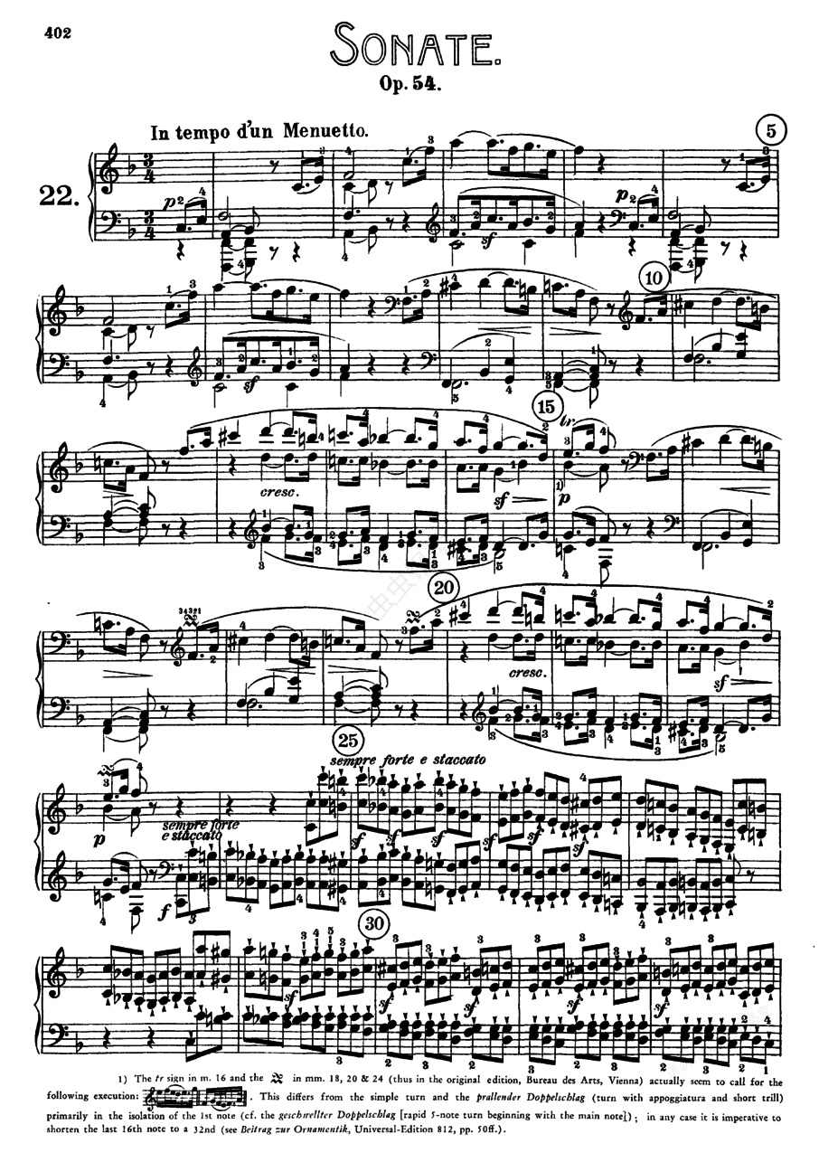 《F大调第二十二钢琴奏鸣曲》Piano in F-dur Op.54 由两个乐章构成。 第一乐章,小步舞曲速度,F大调,3/4拍。柔和的第一主题有小步舞曲风格和节奏。第二主题激烈地出现,两个声部形成卡农形式,与第一主题形成强烈对比。 第二乐章,小快板,F大调,2/4拍,三部曲式。主题在低音部以单音奏出,然后高音部两小节后紧跟其后一起进行。第二段是这一主题的反战,由A大调开始,然后不断进行各种转调。结尾转快速,这部分也完全之用第一主题。