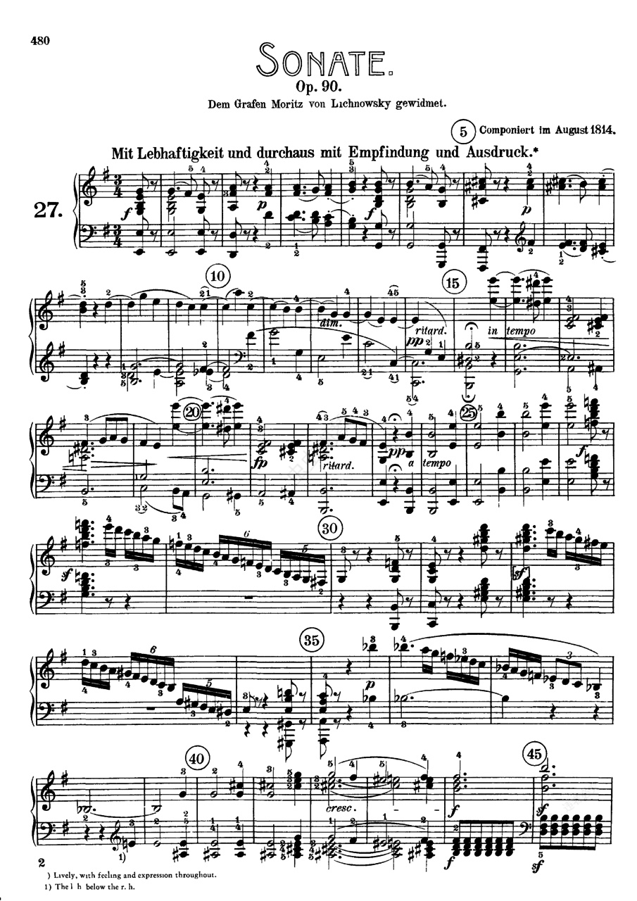 1813年法军在莱比锡、维多利亚吃了败仗,整个欧洲形势有了很大的转机。1814年维也纳会议期间,各国代表、贵族们都竞相围绕着贝多芬,贝多芬之名当时红遍了整个欧洲上层社会。然而在作品方面却十分消沉,与社交方面的光荣成反比。这首《e小调第二十七钢琴奏鸣曲》Piano in Op.90 就是在这种情况下产生的。 全曲由两个乐章组成,都是快速度。在乐曲中已经含有了与中期风格相距甚远的,充满很感慨的音响,也可以听到歌颂憧憬远景的旋律。有人问贝多芬有关乐曲的意义时,他笑着说,第一乐章是“理性与感性之争”,第二乐章是“与情人的对话”。 第一乐章,稍快,始终充满感情与表情地,e小调,3/4拍,奏鸣曲式。第一主题以活泼生动的节奏开始。第二主题是b小调,随后是以十六分音符音型的伴奏所奏的平静的小结尾。展开部是以幽默的单音开始,以第一主题开始的部分材料做发展。之后进入再现部。 第二乐章,不太快地,充分歌唱似的,E大调,4/4拍,回旋奏鸣曲式。主要主题部分是三段体,旋律极为抒情。经过强柔力度繁忙交替的短暂的经过部,副主题在B大调上出现。主要主题再现后,进入展开部,首先发展主要主题的最后部分,然后是副主题后面的一段乐思。主要主题第三次出现后,副主题在E大调上再现,最后出现变化了的主要主题,并将它发展而变成尾奏,乐曲幽静的结束。