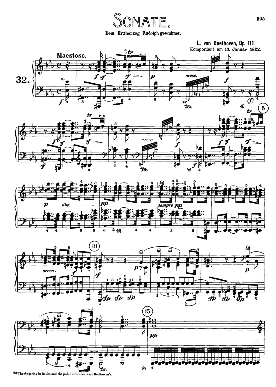 贝多芬将这部《e小调第三十二钢琴奏鸣曲》Piano in Op.111 缩短成两个乐章。第一乐章是奏鸣曲式中加进了对位手法,第二乐章则用了变奏曲,可以说完全是后期的创作风格。而且这两个乐章形成尖锐的对比,第一乐章是拥有如暴风骤雨般的激烈与紧缩起来的紧张感,而第二乐章则是将精神解放,并高扬于无穷无尽的世界中。关于这两个明显的对比,历来有各式各样的解释。贝多芬周围的人不停的提出对于第三乐章的询问。据说贝多芬对于辛德勒所提出的询问,只回答了一句话,“因为时间不够”而已。这句话很可能是贝多芬故意开的玩笑,其实如果我们在这一乐曲的变奏曲乐章的最后,恍恍惚惚的看到精神飘渺浮升于遥远的天空时,我们就不得不深切地感到这部奏鸣曲已没有任何值得加上去的东西了。 第一乐章,庄严肃穆地、朝气蓬勃而热烈的快板,c小调,4/4拍,奏鸣曲式。庄严肃穆的序奏,是由激烈的减七和弦开始。充满了灰暗而庄重的气氛。主部是朝气蓬勃而热烈的快板,先在一个很大的渐强后,以很强的力度奏出第一主题的动机,然后立即加以反复而出现第一主题的全貌。第二主题在降A大调,是在激流中流出的清澈的旋律。展开部以第一主题的赋格风格的发展为中心。再现部中第一主题以八度音程的齐奏强有力的再现,第二主题以C大调再现。 第二乐章,极为朴素的如歌的慢板,C大调。由主体与五个变奏所构成。主体是二部曲式的小抒情曲,9/16拍。是平静至极的歌曲,是使人有无限深情之感的著名旋律。第一变奏是随着三连音的伴奏,右手以一定的节奏做主题旋律始终连奏的变奏;第二变奏是6/16拍,节奏变得更为精巧;第三变奏为罕见的12/32拍,是琶音在广大的音域内旋转得极为豪华的变奏;第四变奏回到9/16拍,在弱奏的震音上,以和弦浮现旋律的飘渺部分,与主题融化在高音区细致的音的流动中的部分,两者形成对比;第五变奏是在极为细致的伴奏音型之上,忠实地奏出主题,然后像是不忍心让它结束似地,将它扩大之后,奏出颤音进入尾声。