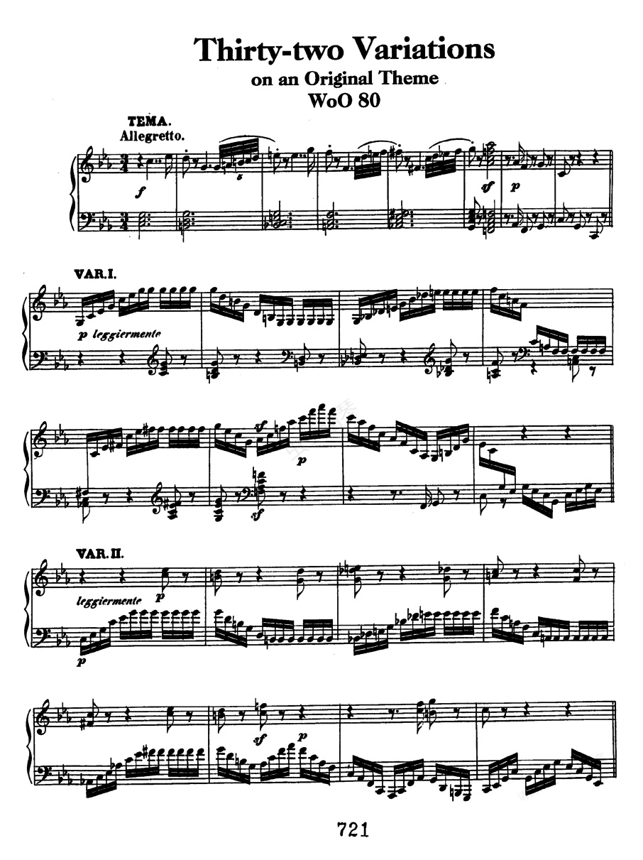 《c小调三十二段变奏曲》32 in c Minor WoO.80 ,作于1806~1807年间,主题非常短小,是一段体的小快板,仅八个小节,并有著巴洛克式的恰空舞曲风格,完整而强韧的上下旋律线,潜藏著惊人的张力与发展力。开头3个变奏由含分散和弦的十六分分音符音群构成,在第四、五变奏速度变化后,第六变奏以三连音型给人印象深刻。接下的3段变奏,以十六分分音符的分散和弦作基础,第十变奏左手奏出强劲音群,至十一变奏达到第一顶点。十六变奏达到第二顶点。自十九变奏至二十一变奏,以六连音音群为基础,二十二变奏以八度赋格达到第二顶点。第二十三至二十五变奏变得非常轻快,到二十九变奏两手逆行,达到第四顶点,第三十变奏是半音阶进古的圣咏风格,有间奏意味,至二十二变奏,分散和弦支持音阶性音群,达到最高顶点。