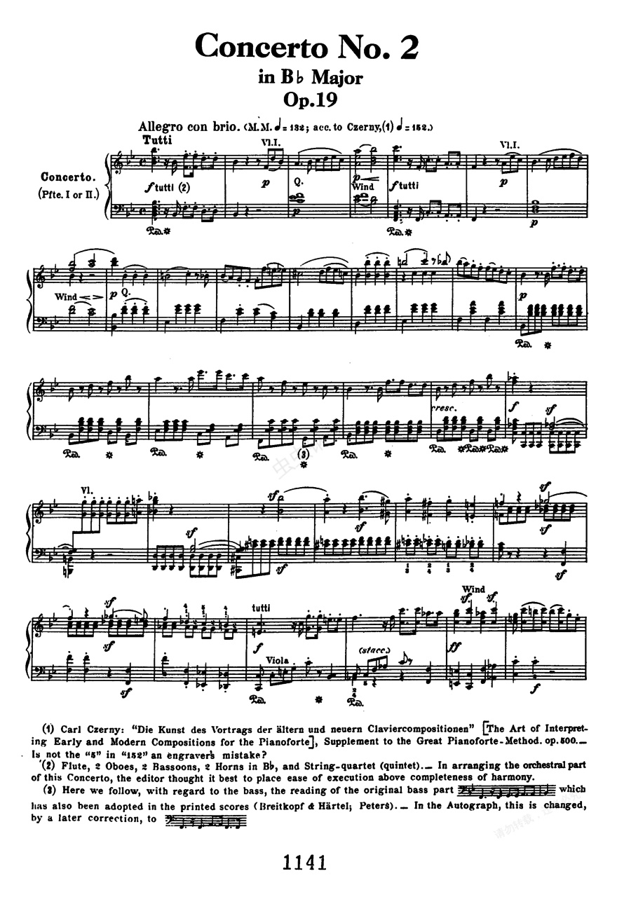 《降B大调第二钢琴协奏曲》Piano No.2 in Major Op.19 ,创作先于他的《C大调第一钢琴协奏曲》Op.15 ,约作于1795年,题献给卡尔·尼科(Carl Nikl),分别于1798年及1801年进行两次修订。为了使这部作品专由他本人演奏,贝多芬把它延迟到1801年才出版;而且一直等到付印时,才把独奏部分全部写出来。该作乐队的编制规模较小,给人以柔和之感,其中更能看出莫扎特的神髓。当时的听众尽管对这部作品加以赞赏,却又多少对乐曲中某些偏离传统的特点感到困惑。而今天我们听起来,却会对作品表现出的有节制的情感爆发以及强烈的对比感到由衷的钦佩。全曲共三个乐章:    第一乐章,辉煌的快板,降B大调,4/4拍,奏鸣曲式。乐章的第一个呈示部的第一主题用乐队呈现两个对比的形象,一个刚毅有力,带有附点节奏;一个富于歌唱性。第二主题是新的抒情性插段,它在第二呈示部并不出现,只在展开部中得以发展。乐章的第二个呈示部同样有很多旋律。    第二乐章,慢板,降E大调,3/4拍,变奏曲式。音乐特点同海顿有些近似,是哲学式的凝神沉思,十分严峻,但又充满诚挚、温暖的感情。第一主题由第一小提琴呈示,钢琴将此主题华丽的装饰反复。随后钢琴奏出琶音连续的部分,乐曲洋溢着幻想韵味。    第三乐章,回旋曲,极快板,降B大调,6/8拍,回旋奏鸣曲式。钢琴突然出现切分音节奏,呈示出如杜鹃一样的叫声般的轻快而有趣的主要主题。副主题的音响更柔和,贝多芬用乐队出人意外的音调和节奏重音,造成了充满喜剧性的效果。在这个构思独特的乐章中,那些节奏的转换和突然的重音,都是贝多芬所独有的,在乐章当中由一段显得尤其突出。在展开部中出现的新主题里那些调皮地不断反复的动机,也十分引人注意。在再现部的结尾,主要主题突然和缓下来,好像摆出一副庄重、雄伟的姿态,一本正经似的,但乐队随即用更大的热情强有力地恢复原来的面目。近乐章结束时,音乐的进行停顿一下,然后乐队全奏用几个强烈的和弦结束全曲。