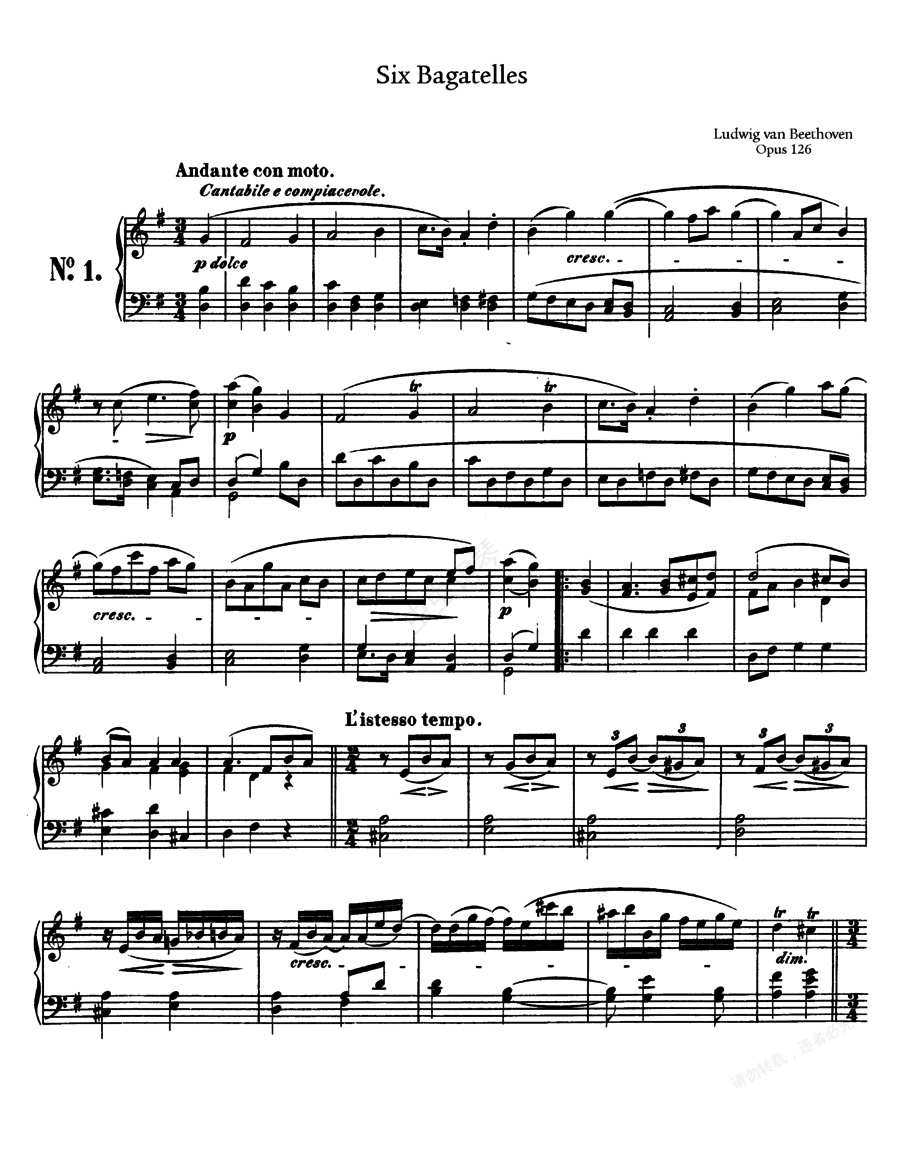 《六首小品》Sechs Op.126 是1823年完成《d小调第九交响曲》之后的小品集,是贝多芬3套小品集中最优秀者。这六首小品分别为: 1.活跃的行板,G大调,三段体: 2.快板,g小调,分为3段,但非三段体,即兴风格; 3.行板,降E大调 优美的主题,有竖琴味的华彩; 4.急板,e小调,六首中的最杰出者,三段体,有谐谑性格; 5.近似稍快板,G大调,轻快如牧歌般的旋律; 6.活跃而可爱的行板,降E大凋,序奏—自由的三段体,中段使用了奏鸣曲发展部的形式。