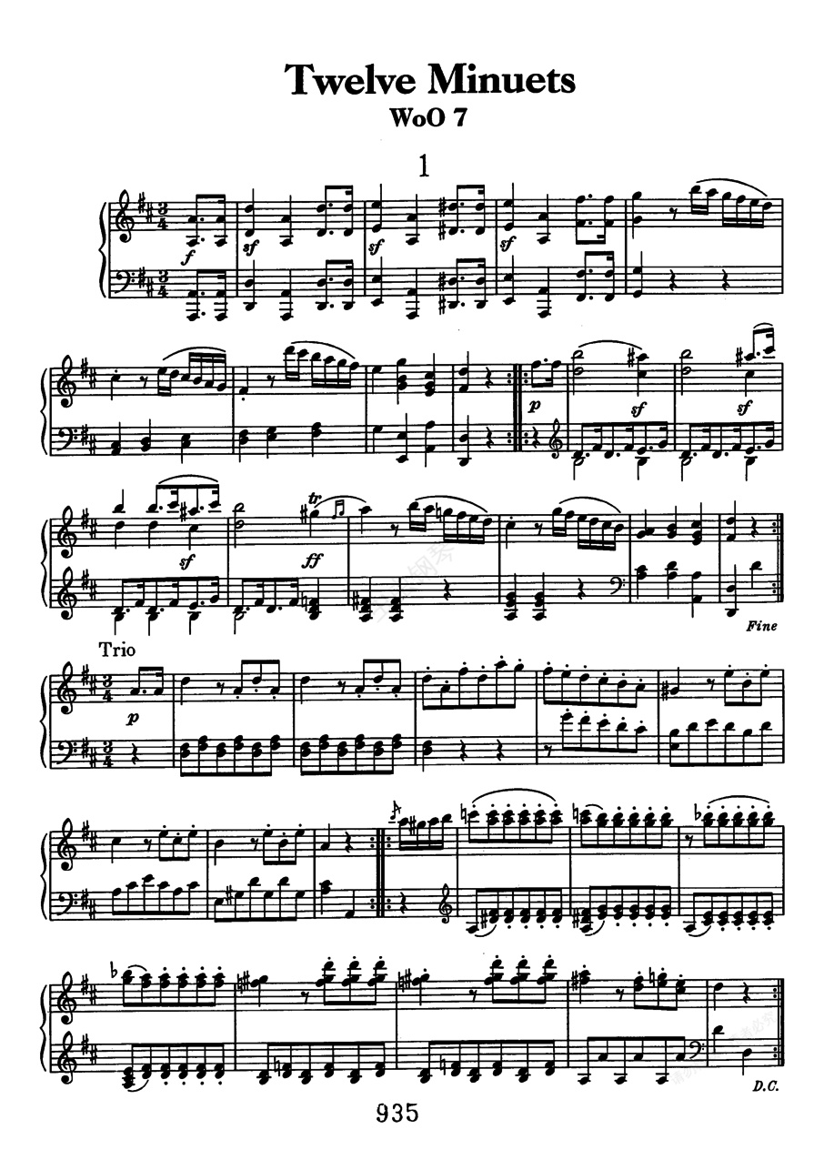 “小步舞曲” 原是流行于法国农村中的一种民间舞蹈音乐,后来逐渐进入宫廷,成为贵族舞曲。自从小步舞曲脱离了宫廷舞蹈关系之后,往往常用于奏鸣曲、交响曲的第三乐章,或成为独立的作品。小步舞曲大多采用3/4拍子,中速,节奏平稳,风格典雅、明快、轻巧。一般采用三段式写成。 《十二首小步舞曲》12 WoO 7 ,约作于1795年。 1. D大调 2. 降B大调 3. G大调 4. 降E大调 5. C大调 6. A大调 7. D大调 8. 降B大调 9. G大调 10. 降E大调 11. C大调 12. F大调
