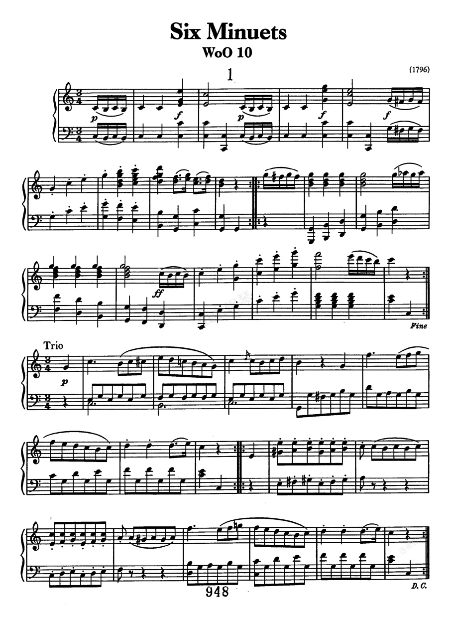 《六首小步舞曲》6 WoO 10 ,又称“社交小步舞曲”,作于1796年。据推测,这一曲集很可能是由1795年为管弦乐队而作的小步舞曲集改编而成的。其中的第二首《G大调小步舞曲》是最为通俗、流传最广的一首,也是贝多芬最为人所知的作品之一。它具有鲜明的规格性,乐曲结构完整、排列规范、具有古典舞曲应有的特征。乐曲为典型的“三段体”结构,第一主题由两个小段构成,单纯简洁、典雅庄重。第二主题(中部)同样规整地排列着两个小段,充满活泼轻快的情趣。最后是与第一段形成对比的第一主题的反复。贝多芬的这首《G大调小步舞曲》被改编成小提琴、长笛、吉他、轻音乐等各种演奏版本,成为外国通俗名曲之一,深受广大听众的喜爱。 1. C大调 2. G大调 3. 降E大调 4. 降B大调 5. D大调 6. C大调