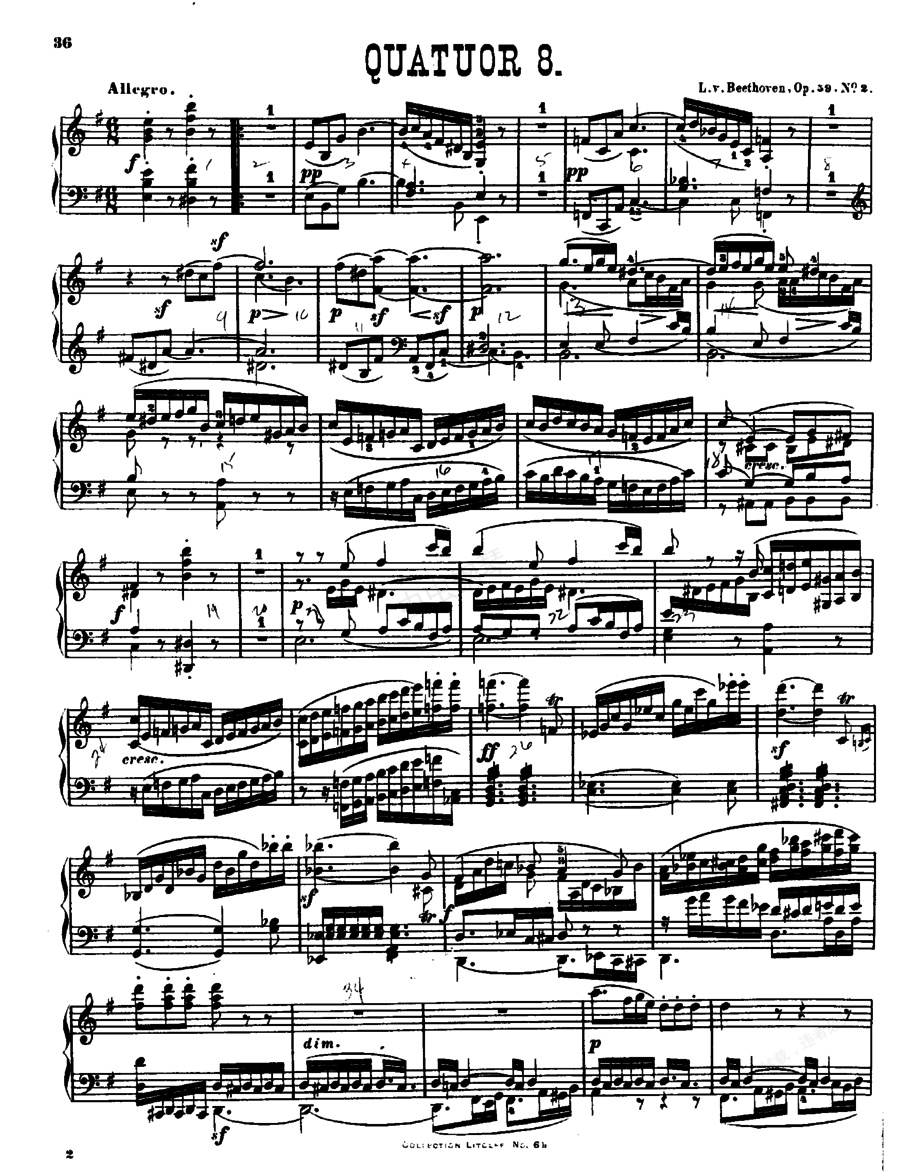 《e小调第八弦乐四重奏》 No.8 in e Minor Op.59-2 ,是作于1806年的 Op.59 三部弦乐四重奏中的第二部。如果说Op.59-1 外在形式的拓展不同,那Op.59-2 则追求内省的拓展。全曲共四个乐章: 第一乐章,快板,e小调,6/8拍,奏鸣曲式,这一乐章完全受第一主题支配,其中充分展示出复杂和声的魅力。其发展部极为简朴,但和声发展却极为艰深。 第二乐章,甚柔板,E大调,4/4拍,奏鸣曲式,贝多芬标示“以深切的感情来演奏本乐章。”其中第一小提琴宁静地奏出第一主题,其他乐器以慢半小节的方式依次模仿,第二小提琴及中提琴以八度音程反复,第一个提琴演奏细腻的对位,都极为迷人。在这个乐章中,引用了《命运交响曲》的动机。 第三乐章,小快板,e小调,3/4拍,谐谑曲,中段转成E大调,中提琴演奏俄罗斯民歌主题,第二小提琴演奏三连音符流动般的对位旋律,然后主题以赋格发展,最后以快速结尾形成高潮。 第四乐章,终曲,急板,e小调,4/4拍,回旋曲式。在第三乐章中的愁绪在此乐章转为明朗,第一主题构成的发展部以赋格方式展开,最后又以第一主题节奏构成活泼的最急板尾声。