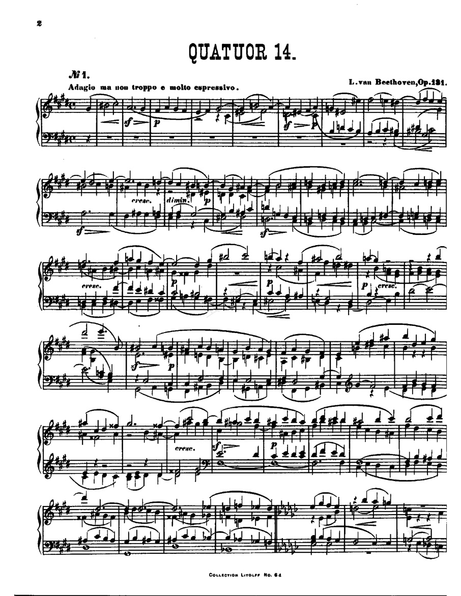 《升c小调第十四弦乐四重奏》 No.14 in Minor Op.131 ,作于1826年,贝多芬逝世之前的8个月。它实际上是在《第十五弦乐四重奏》Op.132 之后完成的,是贝多芬最为优秀的一部弦乐四重奏。此曲最初呈献给友人沃福麦雅,后因军官斯图特汉姆(Baron von)录用了贝多芬的侄儿卡尔,于是该作改赠给这位军官。全曲共七个乐章,各乐章连续不间断地演奏: 第一乐章,深情而不太慢的柔板,升c小调,4/4拍,自由的赋格曲式。此赋格由三部分构成,第一部分由第一小提琴呈示主要主题,第二小提琴以低五度应答,其它乐器承接而展开赋格。第二部分由第一小提琴奏出从最初主题导引出的旋律,接着第二动机登场。这些主题展开后,第三部分从中提琴陈述最初的赋格主题开始,其他乐器顺序追逐表达赋格。 第二乐章,活泼的甚快板,D大调,6/8拍,小提琴展示一个回旋曲主题,以这一单一主题发展出各种旋律,以对位方式展开。 第三乐章,中庸的快板-慢板,A大调,4/4拍,非常短小,实际是下一首变奏曲的序奏。 第四乐章,如歌的不太慢的行板,A大调,2/4拍,由以两部形式构成的32小节主题、6段变奏和尾奏组成。 第五乐章,急板,E大调,2/2拍,谐谑曲,其中中段由两个旋律为素材构成,曲子返回谐谑曲主部,中段音乐再现,接着第一段第三次再现后,移入结尾部。 第六乐章,近似行板的柔板,升g小调,3/4拍,此乐章也可视为终曲两段体的序奏。 第七乐章,快板,升c小调,2/2拍,奏鸣曲式,结尾有很辉煌的表达。