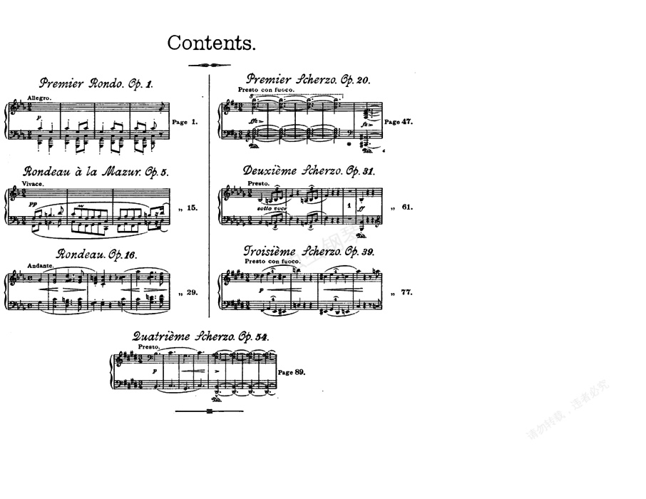 肖邦的 谐谑曲 是音乐形象对比鲜明结构庞大的一种单乐章的钢琴独奏曲,共有四首。它们是肖邦无处可逃的热情和幻想的产物。他把这种从属于其他体裁的形式发展成独立的乐曲形式。这些谐谑曲已不同于以往的谐谑曲体裁,不再限于嬉戏、玩闹而是隐含了深刻而复杂的思想内容。四首谐谑曲,特点各不相同,但一般认为这些作品是简单的三段体,包含一段谐谑曲和与之形成强烈对比的中段(快-慢-快,与他的“夜曲”正好相反)。 李斯特认为肖邦的练习曲及谐谑曲,最能披露他自己隐郁的一面。他说:“肖邦的多数练习曲及谐谑曲,都在表明激烈的愤怒及失望的情绪,时而会有辛辣的讽剌和顽固的自尊。他的音乐所具有的隐郁的侧面,并不象他那优美的诗一般的曲调那样容易被人理解,也不易引起人们的注意。肖邦个人的性格也因此而常被人们误解。肖邦平时为人正直,彬彬有礼,才貌双全,内向文静,但经常表现出快活的样子来。” 谐谑曲本来是贝多芬继承海顿、莫扎特的小步舞曲,再经过发展而成的一种音乐体裁。不过,真正使这种曲子更为积极化,形式化,并且大胆地命名其为“谐谑曲”的,是肖邦。 谐谑曲本意味着戏谑,但肖邦这一套作品中却并无突出的戏谑,反而多忧郁和对个人的反抗,其实是包含着对自身的嘲笑与挖苦。李斯特认为,这套谐谑曲表达的是“激烈的愤怒与绝望的情绪,时而会有辛辣的讥讽、顽固的自尊。”第一号谐谑曲Op.20是肖邦独奏作品的里程碑,它的确采用了这种形式。但这以后,作曲家凭借更大的想象力开发作品,如第三号谐谑曲Op.39就显然是经过改编的奏鸣曲形式,这部作品以不稳定的音调开头,我们无法从前24个小结识别主题,这样的开头正体现了肖邦的大胆。第二号谐谑曲Op.31是肖邦所有大部头作品中最著名,且永保新鲜的一部。这部分归功于其落差极大的表达方式,从幽灵般的呢喃直至激情迸发,中间的转换是那么突如其来。第四号Op.54虽然也是律动的,却与别的作品又有所不同。这部奔放的作品进一步证明了肖邦音乐艺术不朽的表现力。 《b小调第一谐谑曲》 No.1 in b Minor Op.20 ,作于1831年,于1835年出版,献给亚布烈希特。第一主题是暴风雨般的狂烈,第二乐章注明慢板处,有怪异的和弦。尼克斯这样解说这一曲:“这不是失望的叫声吗?(指开始两个大胆的不协和弦)接着是被环境所幽禁的灵魂,想冲破它,却遭到失败绝望。最后疲惫不堪,陷入田园的美丽梦想。但元气再恢复时,意味着斗争还要开始。” 作品为三段体式。乐曲开始时有两个不协和和弦,曾经大大地震撼了肖邦时代的人们。紧随其后的第一主题带着暴风雨般狂烈的热情在回旋,肖邦像是在此处发怒、反抗、质询一般。第二主题开始时有着怪异的和弦,慢慢地奏着,呈现出非常不愉快的音响; 但这一主题的后半段曲速加快,又产生出活泼而优美的效果来。第一、第二主题,都极有独创性。徐缓的中间段带有丰富的色彩,采用了一首波兰古老的摇篮曲,像是对亲爱的祖国的回忆,也像是祖国母亲在安抚着她那些心头满是创伤的儿子。B大调上轻快流畅的十度音,被认为是肖邦的特色,这部分与充满动摇感觉的第一段形成鲜明的对照。接着开头部分的不协和和弦带着突变的情绪出现,但中间段的“美梦”并未被这突如其来的一拳所击破。然后第二主题前半段的怪异和弦又相继出现,重新引入了不断挣扎、搏斗、渴求的情绪,直到结束仍未看到光明的前景。 肖邦四首谐谑曲中,最著名的就是《降b小调第二谐谑曲》 no.2 in Minor Op.31 ,这也是唯一具有谐谑性质的一首。作于1837年,献给费斯登西斯丁伯爵之女。它没有第一号的悲剧性冲突,而有一定的幻想性和戏剧性,其中也不乏抒情、歌唱性的优美段落,因此,成为经常被演奏、最受欢迎的一首。舒曼说:“这首谐谑曲热情的性格,使人想起以前肖邦的同类曲子,非常富于魄力,把简单、容易、大胆、可爱、憎恶都熔于一炉,把它比拟为拜伦爵士的一首诗,并非是不恰当的。”作品由急板半音量柔声的第一主题第一乐句开始,封·隆兹认为这是质问。然后是轻快与优美,然后“沉迷于思念、诧异与憧憬”,终结部有力而又热情。 《升c小调第三谐谑曲》 no.3 in Minor Op.39 ,作于1839年夏,献给阿道夫•古德曼。这首谐谑曲的主题素材精炼、结构简明,全曲基于主题与两个副主题强烈对比的音乐形象。库拉克说:“肖邦所要求的急速乐曲,用现在那种强有力的平台式钢琴反而会造成乐曲外型的模糊不清,从而失去力度,所以应该以适当的速度弹奏。”因此,这首作品如果想在开始就弹得飞快,一定要有深厚的功力,不然到了必须更快的尾声时,就会失去应有的对比。 引子为威风凛凛的号召声,引出坚毅、挺拔的主部主题,用双八度齐奏,速度标记是有魄力的急板,令人感到贝多芬式的雄壮气魄,并具有鲜明的管弦乐色彩。这是肖邦音乐中少有的篇章,在这里令人感到钢琴的调色板已不能满足肖邦了。尼克斯说这是“显著的心情浮动”。速度转慢的第二主题在降D大调,有着圣咏合唱的风格,把听众引进了完全不同的另一个意境中。“管风琴”奏出的和弦与“水晶”般清澈晶莹的经过句相互交替,极富于色彩性。如果把经过句抽掉,把旋律衔接起来,俨然一支带有田园民歌风的沉思默想的曲调。在这第二主题里还可以听到圣咏的余音和民歌的风味,可以感觉到大自