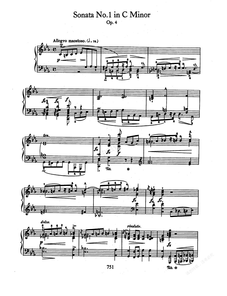 c小调第一钢琴奏鸣曲 Op.4 肖邦共作有三部钢琴奏鸣曲,第一号,c小调,Op.4,作于1828年,属早期作品,目前被演奏的机会极少。第二号,降b小调,Op.35,作于1839年;第三号,b小调,Op.58,作于1844年。 《c小调第一钢琴奏鸣曲》Piano No.1 in c Minor Op.4 ,作于1828年,当时肖邦正值少年时代(18岁),离成熟期还很远。这也是肖邦最初的大型作品之一,它的基本缺点正是由于这个缘故,或许18岁的肖邦还不能克服写大型作品时所遇到的那种困难。这部作品有四个乐章: 第一乐章,戏剧性的庄严快板。主部写得很出色,它充满了贝多芬那种活力,可使人想起肖邦其他一些作品。第一题在快板乐章占统治地位,肖邦没有拿另一个相反的音乐形象来和它对比,第二主笔是从主部的音调中引申出来的,而且甚至还保持着主部的调性,这样一来,肖邦给自己造成了很大的困难:在整个快板乐章里只发展了一个音乐形象。由于少年肖邦还没有掌握这种必要的技巧,于是快板乐章弄得既冗长又乏味。可以个别的段落的构思却很高尚,钢琴写法富有色彩,因此说它是室内性的不如说它是辉煌的音乐会风格曲。 第二乐章,小步舞曲。古典主义音乐传统在这第二乐章中表现得更为明显,只是音响饱满的钢琴写法破坏了古典舞曲的朴质性。这是肖邦唯一的小步舞曲。 第三乐章,小广板,令人想起贝多芬的深刻的、凝神沉思的柔板,同时也明显感到肖邦自己的思想,它表现在古典音乐所少有的五拍子节奏中(这里大约受到俄罗斯歌曲的影响,毫无疑问,肖邦在华沙可以听到这些歌曲),另外还表现在旋律的性质和纯肖邦式的纤秀婉丽的华彩中。 第四乐章,回旋曲,充满了活力和动力,钢琴写法极其华丽。然而,回旋曲的独创性比快板就更少了。而且音乐形象的发展和快板一样不够紧凑洗炼。