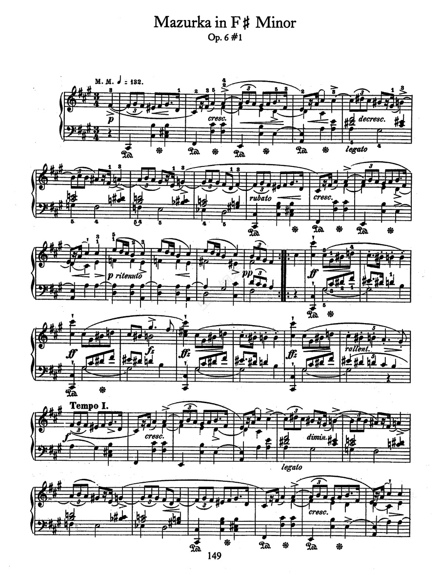 4首玛祖卡舞曲 Op.6 肖邦在生前一共出版了41首玛祖卡舞曲,加上在死后作为遗作整理出版的10首,总计51首。 “玛祖卡舞曲”是肖邦另一个独特的创作领域。在整个钢琴音乐文献中,提起玛祖卡,首先想到的就是肖邦。其他作曲家也有玛祖卡。但唯有肖邦写了大量的、闪耀着特异光彩的玛祖卡。在肖邦本人的作品中,玛祖卡也很特殊。一是这批作品最具波兰泥土的芳香;另外,这是他较少带有戏剧性、悲剧性成分的创作领域之一。 玛祖卡,原文 ,又称 ,波兰乡土舞曲,发源于玛祖维塔() ,乃克拉科维克() 舞的一种,被称为“乖僻的克拉科维克”。肖邦的玛祖卡赋予更精练的旋律,增加了跳跃感,在变化中赋予诗意。它的音乐,都是三拍子的。此外还有库亚维亚克舞曲和奥别列克舞曲也都是三拍子的。肖邦的玛祖卡是集合上述三种舞曲的特点创作出来的。 玛祖卡舞曲的典型节奏在肖邦的玛祖卡中经常显露,但肖邦是出神入化地应用它,远不是刻板地重复民间节奏。旋律,肖邦是天才地吸取民间音乐的精华,按照高度专业化的艺术标准创造出来的。和声、调式更有肖邦独出心裁的创造。尽管如此,玛祖卡的波兰乡土风格毫不减弱;相反,是以更高雅、更诗意的风度,婷婷玉立于钢琴音乐的百花园之中。评论家们说,玛祖卡是肖邦对故乡、土地、人民和对人民光辉精神的生动感觉,是波兰人民的“整个灵魂”。 《四首玛祖卡舞曲》4 Op.6 ,作于1830年,出版于1832年,呈献给布拉蒂伯爵小姐。这是肖邦初次在国外出版的钢琴作品,也是肖邦开始脱离少年时代的习作领域,成为真正的音乐家,发挥了他独特个性的作品。 1. 升f小调玛祖卡 Op.6-1,这首是本组作品中最具旋律性,带有由于情绪的曲子。作品为两个插入部的回旋曲形式,A(升f小调)-B(升C大调)-A(升f小调)-C(升f小调)-A(升f小调),其中第二插部是诙谐轻快的,极为爽快。哈涅卡评价:“仿佛是乡村里的人们都在围着跳舞的情景”。 2. 升c小调玛祖卡 Op.6-2,三段体式。肖邦的玛祖卡在此有了令人意想不到的发展,他在这里把乡野的性格表现得淋漓尽致。第一段升G大调开始转入升c小调;第二段A大调为利地亚调式,活泼的乡村风格;第三段升G大调、升c小调。 3. E大调玛祖卡 Op.6-3,三段体式。第一段为E大调;第二段为B大调,由半音阶的和声装饰;第三段A大调。哈涅卡说:“我们就像是在乡间,看着年轻的男女们有趣的舞蹈。和声丰富,节奏生动。” 4. 降e小调玛祖卡 Op.6-4,除了后半段的反复,仅有24小节,有一种忧郁情绪。