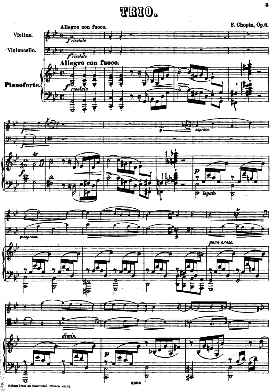 g小调钢琴三重奏 Op.8 肖邦的室内重奏曲为数不多,而且也不失他最优秀、最独具一格的作品,但是,即使在这些室内性的器乐作品里,也非常容易认出他的创作风貌。 肖邦在华沙的年代(1828年)写了一首钢琴、小提琴、大提琴三重奏作品《g小调钢琴三重奏》Piano Trio in g Minor Op.8 。关于这部作品,舒曼说:“关于这部三重奏我还能说些什么呢?我要说的是每一个凡是被这首乐曲感动的人都想说的话。它是如此之崇高,已达最高境界!它是如此之富于幻想,没有一个诗人曾在自己的诗歌中像这样地幻想过!它是音乐,本身就是生活!”但同时舒曼也指出,肖邦写这个作品的时候,“正是他比较偏好技巧性的创作时期”。这主要是指三重奏中响亮又辉煌的钢琴部分而言。肖邦使钢琴在重奏中起着主导作用。 整个三重奏的情调充满了生命的喜悦和乐观的精神,但是四个乐章的音乐却又很不一样。快板乐章昂奋激动,与后面的优雅柔美的谐谑乐章形成对比。谐谑乐章风平浪静,一般钢琴谐谑曲所具有的戏剧性风暴,在这里无影无踪。柔板乐章的悲壮情调转变成末乐章自由自在、轻松愉快的欢乐情绪。末乐章主部主题与《e小调钢琴协奏曲》Op.11末乐章的第一主题相近似,也是从克拉科维亚克舞曲的节奏中延伸出来的。