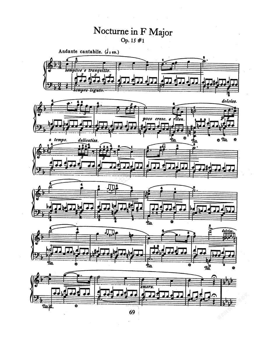 3首夜曲 Op.15 《三首夜曲》Trois Op.15 ,作于1830-1831年,出版于1832年,呈献给费迪南·希勒。其真挚的情感、旋律的优美、构成的巧妙,都超越了Op.9 中的三首。 1. F大调夜曲 Op.15-1,如歌的行板,3/4拍,三段体。第一段为清朗、典雅的行板,十六分音符三连音构成的装饰非常醒目,中段进入有魄力、近似暴风雨的激情部分。当它结束时,一切又回到开始时的优雅的情绪。 2. 升F大调夜曲 Op.15-2,甚缓板,2/4拍,三段体。第一段安祥的主题徐徐奏出,装饰成如歌的华彩,其中孕含丰富的情绪,时而骚动不安,时而如泣如诉,充满了憧憬和幻想色彩。中段加倍速度,情绪起伏也逐渐增大,其中五连音音型以半音量的柔声开始,如同流水般,很具特色,中间声部主题在上声部轻声咏叹,表现出一种不安和希冀。最后,乐曲再现第一部分,极其装饰性的旋律发展,在宁静而充满了希望的情绪中结束。这是非常美的一首,尼克斯评价:“外界的温暖及光渗透到心里,装饰的华彩音像蜘蛛丝似地飘然在我们周围舞蹈。第一段为甜蜜的回忆,中段为不安的情绪,但太阳并不失去其温暖,反而稳住了沉着的情绪,像是夏日遥远的天空那一道彩雾慢慢地消失。” 3. g小调夜曲 Op.15-3,慢板,3/4拍,二段体,第一主题有痛心疾首意味,似乎呻吟,悲叹中的反抗发展到顶点才平静下来,优美的转调后出现幽静的钟声及安慰与希望的第二主题。肖邦在此曲草稿上注明:“在《哈姆莱特》上演之后”,但经过思考后他又抹掉了这句话,改写成“不!还是任意地去想像较好”。