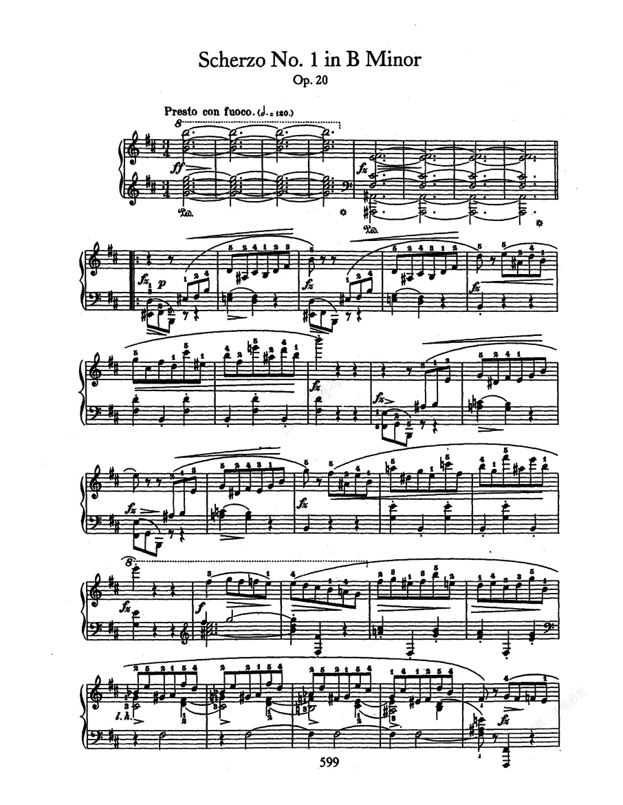 b小调第一谐谑曲 Op.20    肖邦的 谐谑曲 是音乐形象对比鲜明结构庞大的一种单乐章的钢琴独奏曲,共有四首。它们是肖邦无处可逃的热情和幻想的产物。他把这种从属于其他体裁的形式发展成独立的乐曲形式。这些谐谑曲已不同于以往的谐谑曲体裁,不再限于嬉戏、玩闹而是隐含了深刻而复杂的思想内容。四首谐谑曲,特点各不相同,但一般认为这些作品是简单的三段体,包含一段谐谑曲和与之形成强烈对比的中段(快-慢-快,与他的“夜曲”正好相反)。    李斯特认为肖邦的练习曲及谐谑曲,最能披露他自己隐郁的一面。他说:“肖邦的多数练习曲及谐谑曲,都在表明激烈的愤怒及失望的情绪,时而会有辛辣的讽剌和顽固的自尊。他的音乐所具有的隐郁的侧面,并不象他那优美的诗一般的曲调那样容易被人理解,也不易引起人们的注意。肖邦个人的性格也因此而常被人们误解。肖邦平时为人正直,彬彬有礼,才貌双全,内向文静,但经常表现出快活的样子来。” 谐谑曲本来是贝多芬继承海顿、莫扎特的小步舞曲,再经过发展而成的一种音乐体裁。不过,真正使这种曲子更为积极化,形式化,并且大胆地命名其为“谐谑曲”的,是肖邦。    谐谑曲本意味着戏谑,但肖邦这一套作品中却并无突出的戏谑,反而多忧郁和对个人的反抗,其实是包含着对自身的嘲笑与挖苦。李斯特认为,这套谐谑曲表达的是“激烈的愤怒与绝望的情绪,时而会有辛辣的讥讽、顽固的自尊。”第一号谐谑曲Op.20是肖邦独奏作品的里程碑,它的确采用了这种形式。但这以后,作曲家凭借更大的想象力开发作品,如第三号谐谑曲Op.39就显然是经过改编的奏鸣曲形式,这部作品以不稳定的音调开头,我们无法从前24个小结识别主题,这样的开头正体现了肖邦的大胆。第二号谐谑曲Op.31是肖邦所有大部头作品中最著名,且永保新鲜的一部。这部分归功于其落差极大的表达方式,从幽灵般的呢喃直至激情迸发,中间的转换是那么突如其来。第四号Op.54虽然也是律动的,却与别的作品又有所不同。这部奔放的作品进一步证明了肖邦音乐艺术不朽的表现力。    《b小调第一谐谑曲》 No.1 in b Minor Op.20 ,作于1831年,于1835年出版,献给亚布烈希特。第一主题是暴风雨般的狂烈,第二乐章注明慢板处,有怪异的和弦。尼克斯这样解说这一曲:“这不是失望的叫声吗?(指开始两个大胆的不协和弦)接着是被环境所幽禁的灵魂,想冲破它,却遭到失败绝望。最后疲惫不堪,陷入田园的美丽梦想。但元气再恢复时,意味着斗争还要开始。”    作品为三段体式。乐曲开始时有两个不协和和弦,曾经大大地震撼了肖邦时代的人们。紧随其后的第一主题带着暴风雨般狂烈的热情在回旋,肖邦像是在此处发怒、反抗、质询一般。第二主题开始时有着怪异的和弦,慢慢地奏着,呈现出非常不愉快的音响; 但这一主题的后半段曲速加快,又产生出活泼而优美的效果来。第一、第二主题,都极有独创性。徐缓的中间段带有丰富的色彩,采用了一首波兰古老的摇篮曲,像是对亲爱的祖国的回忆,也像是祖国母亲在安抚着她那些心头满是创伤的儿子。B大调上轻快流畅的十度音,被认为是肖邦的特色,这部分与充满动摇感觉的第一段形成鲜明的对照。接着开头部分的不协和和弦带着突变的情绪出现,但中间段的“美梦”并未被这突如其来的一拳所击破。然后第二主题前半段的怪异和弦又相继出现,重新引入了不断挣扎、搏斗、渴求的情绪,直到结束仍未看到光明的前景。