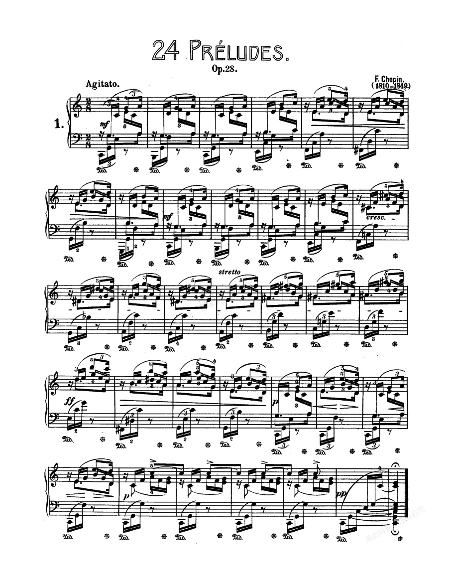 24首前奏曲 Op.28 从十六世纪持续发展至巴洛克时期,是以附属前奏曲为主要形式,当时是以琉特琴或管风琴作为一种“开场白”式的即兴演奏而来,常用和弦与走句交织而成,起到引入“正题”的作用。巴赫等人继承和发展了这种体裁,将前奏曲与赋格、组曲、合唱等曲式连结成套的出现,从而使其取得了“合法”的地位。被举为“音乐圣经”的《十二平均律曲集》就是一套绝佳范例。这一时期前奏曲总的来说,仍具有引子的特点与即兴的手法。 至浪漫主义时期才确立了独立前奏曲的架构。十九世纪是特性小品盛行的时期,肖邦为此时期重要作曲家之一,其作品中的“前奏曲”即为特性小品,他的前奏曲摆脱了“引子”的桎梏,以独特而崭新的面貌出现,在短小的篇幅中,用洗炼的笔法表达出鲜明而富于个性的音乐语言和形象,每一首前奏曲都是一幅完整的图画或印象,从而使之成为音乐会及钢琴教学中的常见曲目。它们奠定了独立前奏曲的模式,影响后期浪漫乃至近代乐派的作曲家,其后,德彪西、拉赫玛尼诺夫、斯克里亚宾、肖斯塔科维奇等不同时期的作曲家又各自奉献了具有独特个性与技巧的前奏曲集,丰富和完善了这一钢琴曲乐种。较之巴洛克时期的前奏曲相比,此时的前奏曲已由“配角”的地位升为“主角”了。因此肖邦对于前奏曲的发展史而言,可说是具有承先启后的地位。 肖邦一共写了二十六首前奏曲,包括Op.28的二十四首,Op.45 以及无编号降A大调。《二十四首前奏曲》24 Op.28 写作于1836至1839年间,这二十四首前奏曲包含了各种不同长度、织度、风格、与多种作曲技巧于其中,调性是以不同的二十四个关系大小调作五度循环的排列,其音乐风格则可以归纳为练习曲、夜曲、玛祖卡、葬礼进行曲、谐谑曲、无穷动、歌谣体、幻想曲与即兴曲等类型。这二十四首前奏曲是以二十四种不同的调写成,由C大调开始,按五度循环进行排列,最后以b小调结束。有人认为,这二十四首前奏曲应视为组曲而连续演奏。 1. C大调前奏曲 Op.28-1 激动的,2/8拍,以相当快的速度演奏,开始的八小节大体上维持在主调上,接着的十六小节做了各种转调,并逐渐加强力度和速度,从二十五小节进入尾声回到主调,最后在最弱的琶音上安静地结束。哈涅卡说:“这首曲子具有即兴曲的性格……当然不是巴赫的风格,但如不是对巴赫做过深入研究的人是写不出来的。他那憧憬的、热情的、激烈的、病态的、慌忙的性质,都是现代性的,瞬息万变的转调也是现代化的。” 2. a小调前奏曲 Op.28-2 慢板,2/2拍。在忧郁重重的和弦上,短小的主题反复了四次,但每次反复都有不同的处理。乐曲的调性转换非常频繁,最后回到主调。哈涅卡说:“这是非常有独创性的发挥,绝望的、使神经焦躁的乐曲。” 3. G大调前奏曲 Op.28-3 活泼地,4/4拍。最初两小节只有左手序奏,有人称这种音型为“纯粹的法国风格”,接着在左手急速的十六分音符伴奏下,右手奏出黯淡的旋律。主题经过反复演奏后,第二乐句被扩展并装饰。最后是右手和左右用相同的音型,像云雾一样消失在高音部,然后很惋惜似地留下两个和弦。哈涅卡说:“左手那涟漪般并又不像下雨的音型,具有练习曲性格。旋律纤细的情绪,精神上属于法国风格。其实是倾向于沙龙的乐曲,没有一点人工的要素。” 4. e小调前奏曲 Op.28-4 广板,2/2拍。乐曲是以高音部的两个音为动机,以及伴奏的和弦不断变化、反复而构成的,其中伴有半音阶的进行,巧妙地表现出忧郁感情的动态。卡拉索夫斯基称这首曲子是“真正的珠玉,能使肖邦以诗人的名字永垂不朽。”这首乐曲曾与b小调前奏曲一起,被用于肖邦的葬礼上,在巴黎由马丁路易教堂的风琴所演奏。 5. D大调前奏曲 Op.28-5 甚快板,3/8拍。乐曲开始处出现的华丽动机贯穿全曲,做种种和声上的处理,编织成绚丽的旋律。 6. b小调前奏曲 Op.28-6 甚慢板,3/4拍。乐曲在高音部的单澜的声音中,真实地模仿令人心烦的雨滴声。低音部轻轻地奏出充满愁绪的旋律,这一旋律哀婉缠绵,充满着对往事的无限怀念和凄苦忧伤的心情。乐曲最后在孤寂伤感的气氛中结束。 1838年12月至1839年2月,肖邦与情人乔治·桑住在西班牙马略卡岛首府帕尔马的瓦雨德莫萨修道院期间,创作了两首带有“雨滴”特征的前奏曲,其中一首就是本曲。乔治·桑后来回忆说:“—个悲惨凄苦的雨夜,当我带着孩子回到房间时,他正在钢琴旁弹奏着一首奇异的前奏曲……后来他对我说,当他弹奏钢琴时,他觉得自己掉进湖里,冰冷刺骨的水不时冲击着他的胸口。当我提醒他注意,当时雨滴的确不时地飘打在屋顶上时,他否认他曾经听到……他在这个晚上所写的作品确实能使人联想到洒落在修道院房瓦上的雨滴声,但在他的想象中,那是从天上掉在他心坎里的泪珠。”乔治·桑的回忆没有指明肖邦当时创作的是两首具有“雨滴”特征前奏曲的哪一首,现在被称为“雨滴”的是肖邦的《降D大调前奏曲》,但也有人认为这首前奏曲才应该冠以“两滴”的标题。 7. A大调前奏曲 Op.28-7 行板,3/4拍。其篇幅短小,由八小节的主题及其变化重复构成的乐段组成。宁静的主题如同一首柔和抒情、略带愁意的短诗,在恬静的意境中结束。俄国著名舞蹈家福金曾用这首前奏曲作他所创作的舞剧《仙女》的前奏曲。 8. 升f小调前奏曲 Op.28-8 更激动的,4/4拍。主旋律由右手拇指弹奏,三