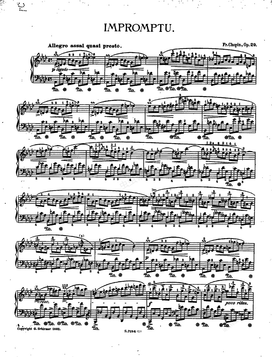 降A大调第一即兴曲 Op.29 即兴曲 这个名称是舒伯特创造的。它没有明显的体裁特征,一般是指作曲家未经事先预备而临时作成的乐曲,即往往是一时灵感的流露。也许正是这个缘故,肖邦的即兴曲在形式上相当自由,但也不是毫无规则地发展,而是有着明显的完整性和统一性。其大多是“快-慢-快”对比的三段式构成,而和“慢-快-慢”对比性的三段式夜曲相反,是以快速的即兴性为主,不似夜曲以慢速抒情为主。肖邦一共作有四首即兴曲,哈聂卡说:“肖邦的即兴曲,是在自由性中有一贯的形式,看来像是自由、独特,却可以感受到构成上的严密。”四首中脍炙人口者是第一号与第四号,最具即兴要素的是第二号。 《降A大调第一即兴曲》 in Major Op.29 ,作于1837年,呈献给德·罗伯伯爵小姐。这是最明朗、最爽快的一首即兴曲,主段看起来是两个声部,而实际上隐藏了好几个声部。全曲以戏谑的形态贯通,左右手连续的三连音符的摆动音型非常迷人。尼克斯对其中段的评述:“像是泉水池里的水泡闪烁着光亮,阳光就照在水面上。”哈涅卡说:“肖邦的即兴曲,是在自由性中有一贯的形式,看来像是自由、独特,却可以感受到构成上的严密。”中段的情调转变,变为沉着镇静的情绪,当主旋律结束,马上又回到原来那种喧嚣的旋律,并导入尾声。