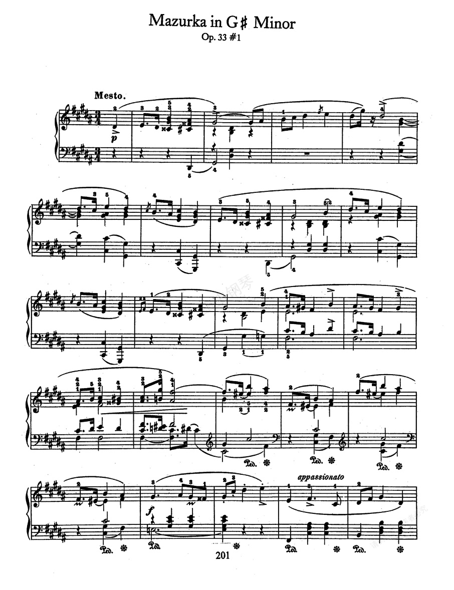 4首玛祖卡舞曲 Op.33 《四首玛祖卡舞曲》 Op.33 ,作于1837-1838年,出版于1838年,呈献给莫斯德卡伯爵小姐。这四首玛祖卡舞曲被认为是肖邦中期的杰作。舒曼对此表示:“肖邦的形式逐渐鲜明、轻快,或者说我们已经习惯于他的风格。不论是谁都会很快地被这些玛祖卡舞曲迷上。” 1. 升g小调玛祖卡 Op.33-1 ,忧伤地,有着单纯而富于冥想的旋律,中段为B大调,哈涅卡认为:“这是心地善良的玛祖卡”乐曲虽短,但却成熟。 2. D大调玛祖卡 Op.33-2 ,活泼地,第一主题具有波兰民间库亚维亚克舞曲的特点,委婉欢快,波浪式的旋律线上下起伏,充满了温暖的生气。这一主题移至A大调重复演奏一遍后,回到D大调,在整个过程中,伴奏声部一直周期性地反复单纯的三拍子节奏型,每小节的中音都落在第三拍上。乐曲的中间部分转为降B大调,采用两种主题素材。前半段出现带有半音上行倾向的音调,旋律缠绵悱恻,带有忧郁悲愁的色彩。接着乐曲在升f小调上呈示以三连音的头拍起奏而占一小节长度的动机,并执拗地把这个动机反复了十六遍。研究肖邦的库勒普斯基解说道:“这一动机表现了坚持用舞蹈摆脱悲愁和苦恼的一种心情,或者是表现了专心致志地思考问题的孩子般纯真的感情。总之,表现了波兰人民的气质”。最后,乐曲再现主题,在充满喜悦的欢快气氛中结束。这首明朗的玛祖卡后来由法国著名女高音维厄多·加尔夏() 改编成独唱曲,并被俄国著名舞蹈家福金编导的舞剧《仙女》选为配乐。 3. C大调玛祖卡 Op.33-3 ,纯朴的,三部曲式,第一段C大调,第二段降A大调,第三段为第一段重复。这首玛祖卡短小而优美,并因肖邦和德国作曲家、克莱门蒂的学生迈耶贝尔激烈的争论而更加著名。一次,肖邦在弹奏此曲时,迈耶贝尔走进来,听完肖邦弹奏后,他说这首乐曲是2/4拍,肖邦却非常坚决地说是3/4拍,两人便因此争执了相当长的时间。造成这种吾会的原因是,肖邦在小节的最后拍上加上了连线的缘故吧。 4. b小调玛祖卡 Op.33-4 ,忧伤地,复三部曲式。第一段为A-B(降B大调)-A-B;第二段为C(B大调)、D(B大调);第三段为重复第一段、尾声。这首优美的作品是在同类作品中最为人们亲近和喜爱的。