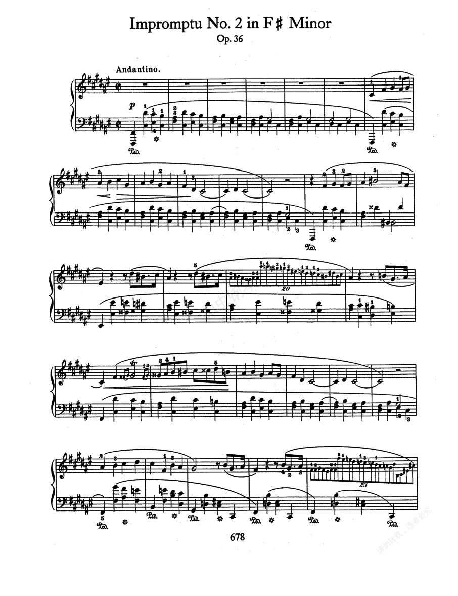 升F大调第二即兴曲 Op.36 《升F大调第二即兴曲》 no.2 in Major Op.36 ,作于1839年,表现形态为叙事曲的叙述要素及夜曲冥想要素的综合。有人认为这首即兴曲具有标题性,开始部分在晚钟似的低音部上方,传来忧郁而富夜曲风格的旋律,仿佛一首低吟的摇篮曲,接着的连续和弦转入左手带切分音伴奏的部分,似乎是响起了战斗的音调,接着宛如骑士驰去,夜曲风格旋律在三连音符音型伴奏下转入F大调重现,宛如骑士的爱人继续在唱着摇篮曲。随后主旋律经过修饰并加以变化处理,尤其三十二分音符处理非常迷人,似乎出现了光明和希望的景象。最后回到梦幻和弦,然后似烟雾渐渐消散,以乐观的情绪结束。