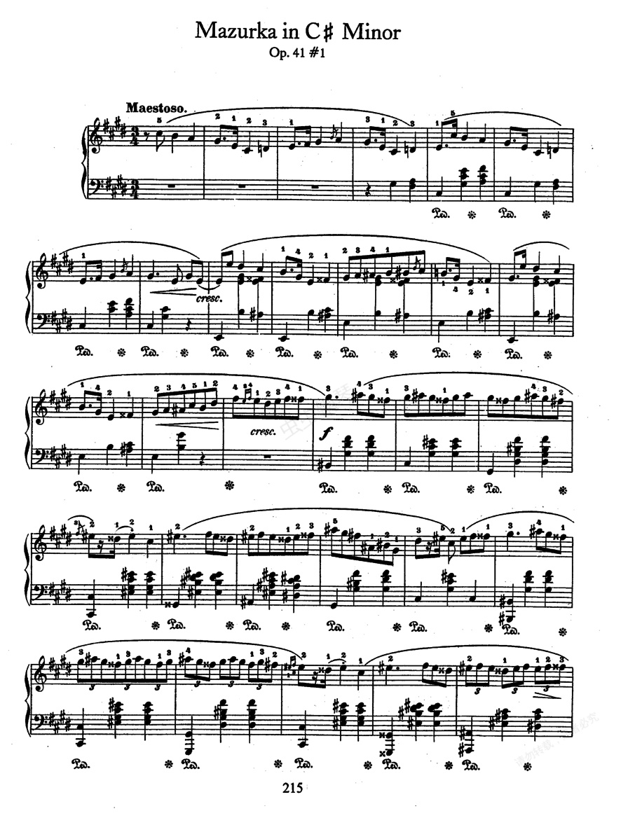 4首玛祖卡 Op.41 《四首玛祖卡》 Op.41 ,作于1838-1839年,出版于1840年。肖邦自己评价这四首作品:“这些曲子在我看来都是很优美的,就像是年老的双亲看着可爱的幼儿一般”。 1. 升c小调玛祖卡 Op.41-1 ,庄重的,复三部曲式。哈涅卡评介说:“这首升c小调节奏非常鲜明,音阶富于异国情调,节拍多断奏,旋律沉浸在伤感的氛围中,但依然富于勇气。主题在内声部、低音部,最后有充分的和声,表现令人惊奇,音响执拗。八度音一直保持到和声消失都有良好的轮廓,这里体现了真正的节奏的净化。” 2. e小调玛祖卡 Op.41-2 ,小行板。这是一首抒情性、歌唱性较强的玛祖卡舞曲,是肖邦于1839年在地中海的马略卡岛上养病期间创作的。作品的情绪是那样的悲伤而深切,寄予了肖邦别国离乡、只身流亡,不胜哀愁的感受。哈涅卡说:“悲伤到能令人落泪。” 3. B大调玛祖卡 Op.41-3 ,生动地,三段体。第一段为B大调、降E大调、D大调;第二段为G大调、E大调;第三部分重复第一部分。这是肖邦于1839年,从马略卡岛的归途,住在乔治·桑家时完成的作品,有人认为这是肖邦玛祖卡舞曲中最没有特色的一首,但哈涅卡评价说;“这是强壮、明朗的舞曲。” 4. 降A大调玛祖卡,Op.41-4 ,小快板,采用圆舞曲节奏型,复三部曲式。这首作品虽然优美,但与同时期的其他玛祖卡舞曲相比要差一截。哈涅卡评价说:“有着嬉戏的性格,装饰的外表,但没有深厚的情绪。”
