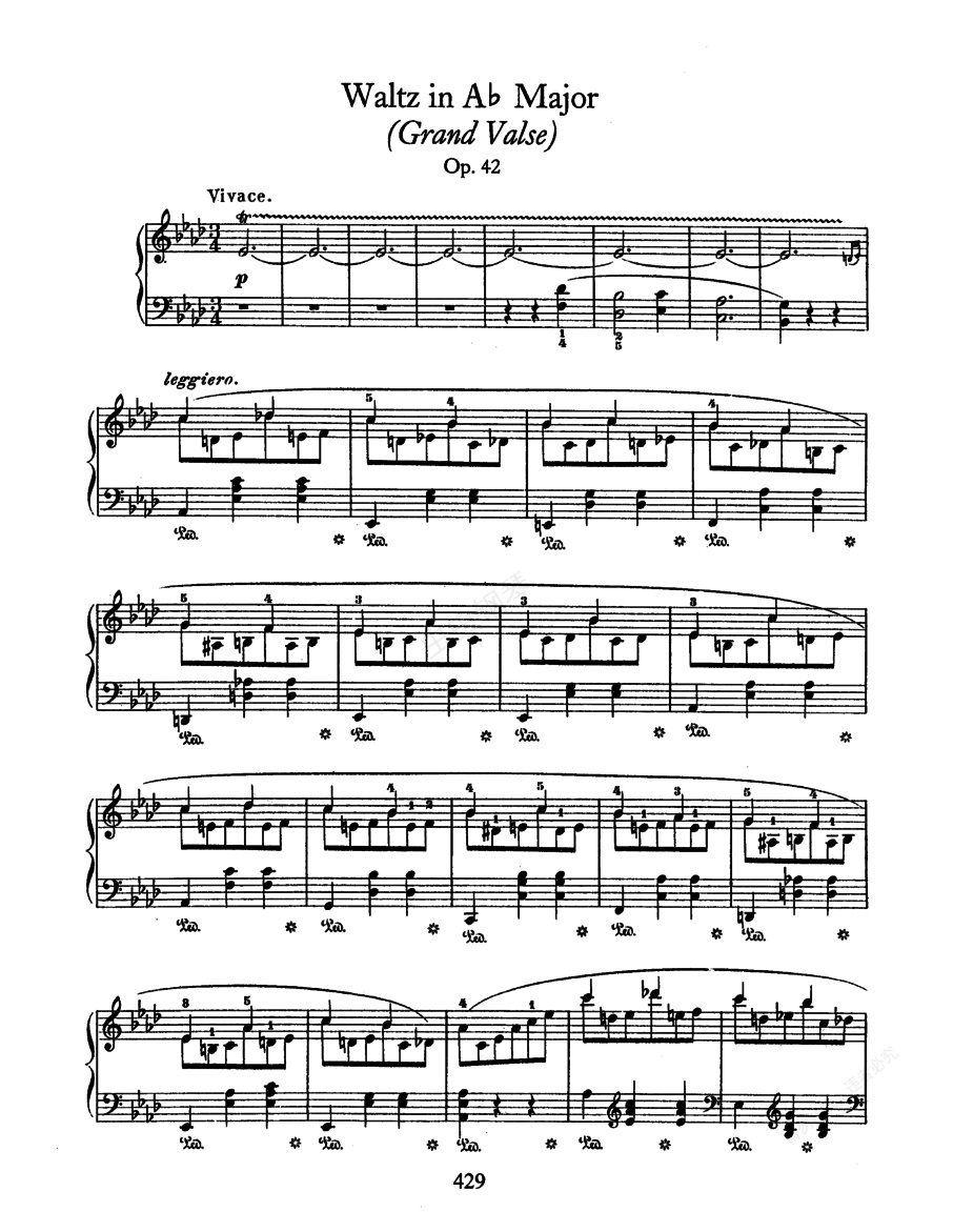 降A大调华丽圆舞曲 Op.42 《降A大调华丽圆舞曲》 Valse in Major Op.42 ,作于1840年。有人认为这是肖邦圆舞曲中最杰出的作品,发挥了钢琴技巧最高的效果。乐曲在圆舞曲节奏音型的伴奏下,创造出许多性格各异的主题旋律,相互对比,融为一曲,就像一束五彩缤纷的鲜花。其中一个快速流动的华丽主题,先后出现六次,听起来像是一首回旋曲。 在八小节持续音的序奏之后,呈示第一段的主旋律,这是用二拍子的节奏,以三拍子的伴奏来组合构成的。第二段是急速的运动,有灿烂而激烈的冲动。第三段出现新的旋律,第四段是将新旋律以小调呈现。之后是这些旋律的反复。最后的尾声被认为是肖邦圆舞曲中最优异者。