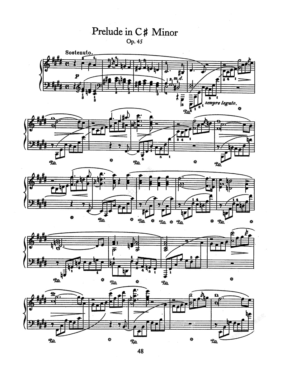 升c小调前奏曲 Op.45 除了Op.28 的二十四首前奏曲外,肖邦于1841年另外单独发表了一首标题为“前奏曲”的作品。《升c小调前奏曲》 in Minor Op.45 ,2/2拍,如歌的行板,这首甜美动人的作品比Op.28 中的任何一首都更像前奏曲。事实上,这首曲子从内容来说,称它是即兴曲也很恰当,这是由于此曲有巧妙的转调之故。据闻当初肖邦是觉得除“前奏曲”外别无适当的标题,才以此名来发表。