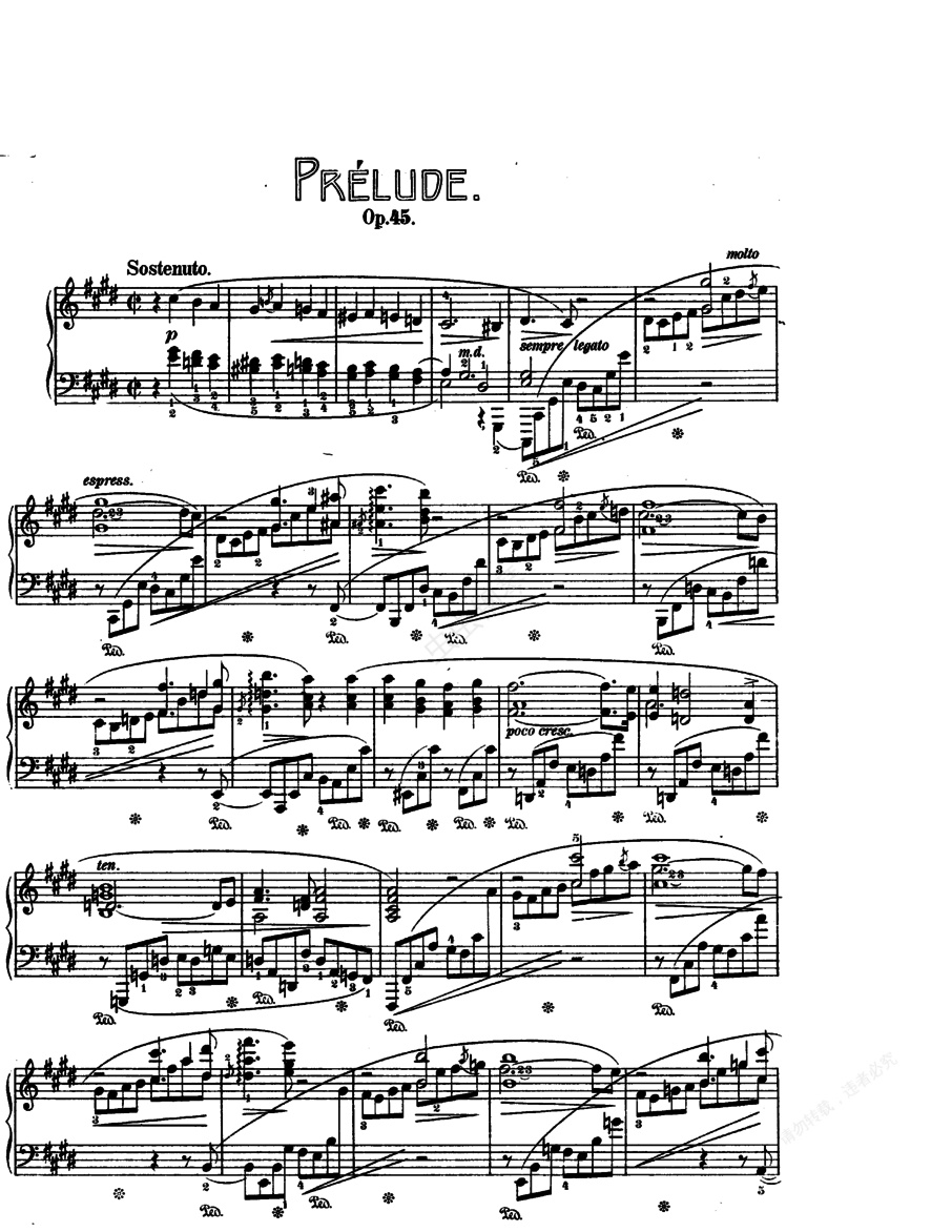 升c小调前奏曲 Op.45 除了Op.28 的二十四首前奏曲外,肖邦于1841年另外单独发表了一首标题为“前奏曲”的作品。《升c小调前奏曲》 in Minor Op.45 ,2/2拍,如歌的行板,这首甜美动人的作品比Op.28 中的任何一首都更像前奏曲。事实上,这首曲子从内容来说,称它是即兴曲也很恰当,这是由于此曲有巧妙的转调之故。据闻当初肖邦是觉得除“前奏曲”外别无适当的标题,才以此名来发表。