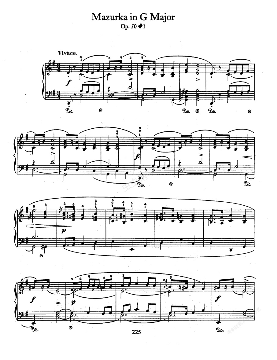 3首玛祖卡舞曲 Op.50 《三首玛祖卡舞曲》Trois Op.50 ,作于1841-1842年,出版于1842年,呈献给西米特斯基。 1. G大调玛祖卡 Op.50-1 ,活泼地,旋律中充满了喜悦,非常优美。采用回旋曲式,A-B(e小调)A-C(c小调)-A-D(c小调)-E(A的变奏、c小调)。 2. 降A大调玛祖卡 Op.50-2 ,小快板,复三部曲式。第一部分(A):序奏、a、b(f小调)a;中间部分(B):c(降D大调)、c(降b小调)。第三部分(A):是缩短再现的a段。哈涅卡评价说:“这是贵族的玛祖卡舞曲,是完整的典型的作品。” 3. 升c小调玛祖卡 Op.50-3 ,中板,三部曲式。第一段为A大调;第二段为B大调、E大调、升G大调;第三段发展第一段,尾声。这是规模最大的玛祖卡之一,在内容的情绪方面是最富有玛祖卡舞曲风格的一首,尤其是开始部分,有着古典的情调,短暂的卡农形式,显示了对巴赫的尊重。和声也是非常吸引人的。冯•隆兹评说:“开头好像为管风琴而作,却断然以沙龙风格结束,没有一首作品像这样被推敲过。”
