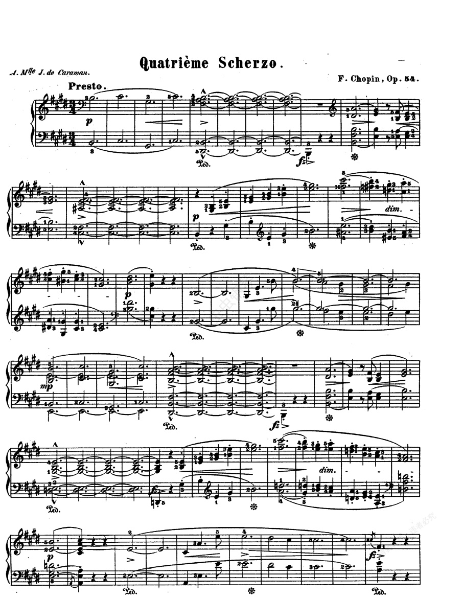 E大调第四谐谑曲 Op.54 《E大调第四谐谑曲》 No.4 in E Major Op.54 ,作于1842年,献给珍妮•德•卡拉曼小姐。这是肖邦最长的一首谐谑曲,在他的这种体裁的作品中占有特殊地位。肖邦晚年健康每况愈下,但他的精神、感情并不随之虚弱,相反地却相当坚强,这一点可以在他的作品中感觉出来。这首最后的谐谑曲,比他在8年前发表的第一谐谑曲更为优异、轻快,也隐藏着幸福的情绪,奔放而充满喜悦。其乐思单纯、明朗,没有前面三首那样华丽而富于幻想性。乐曲主题和其他谐谑曲一样,为3/4拍的急板,活跃而轻巧,是一连串飞掠疾驰的形象,充满光辉。这是一系列不同的、有时语言难以说明的情绪在相互更替——它们总的情调是明朗的,但抹上了一层“回忆”的忧郁。这是对少年时代的回忆,对那些永不会忘记也用不能返回的一切愉快美好的回忆。中段主题旋律纯朴如歌,非常出色,对于肖邦来说,它有点出乎寻常。这支忧伤沉思的圆舞曲似的旋律,毫无疑问是由生活浪漫曲的音调发展而成的。全部“回忆”情绪的意境以一个短小的结尾结束,这是全曲中最优异的,不论是技巧、内容,都有到达巅峰的感觉,表现出肖邦谐谑曲所特有的、精神奋发的气势。