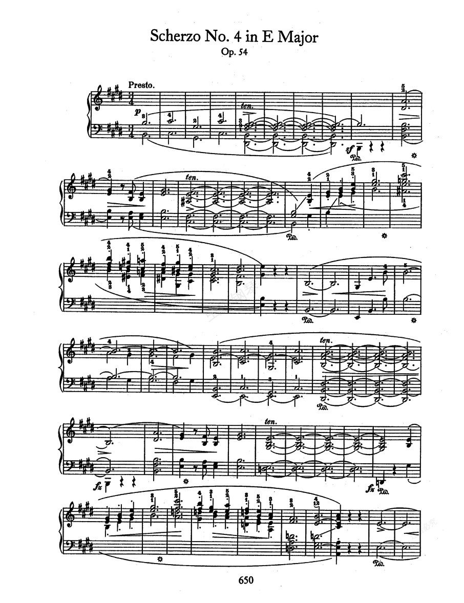 E大调第四谐谑曲 Op.54    《E大调第四谐谑曲》 No.4 in E Major Op.54 ,作于1842年,献给珍妮•德•卡拉曼小姐。这是肖邦最长的一首谐谑曲,在他的这种体裁的作品中占有特殊地位。肖邦晚年健康每况愈下,但他的精神、感情并不随之虚弱,相反地却相当坚强,这一点可以在他的作品中感觉出来。这首最后的谐谑曲,比他在8年前发表的第一谐谑曲更为优异、轻快,也隐藏着幸福的情绪,奔放而充满喜悦。其乐思单纯、明朗,没有前面三首那样华丽而富于幻想性。乐曲主题和其他谐谑曲一样,为3/4拍的急板,活跃而轻巧,是一连串飞掠疾驰的形象,充满光辉。这是一系列不同的、有时语言难以说明的情绪在相互更替——它们总的情调是明朗的,但抹上了一层“回忆”的忧郁。这是对少年时代的回忆,对那些永不会忘记也用不能返回的一切愉快美好的回忆。中段主题旋律纯朴如歌,非常出色,对于肖邦来说,它有点出乎寻常。这支忧伤沉思的圆舞曲似的旋律,毫无疑问是由生活浪漫曲的音调发展而成的。全部“回忆”情绪的意境以一个短小的结尾结束,这是全曲中最优异的,不论是技巧、内容,都有到达巅峰的感觉,表现出肖邦谐谑曲所特有的、精神奋发的气势。