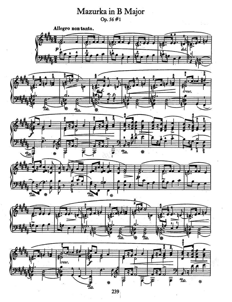 3首玛祖卡舞曲 Op.56 《三首玛祖卡舞曲》Trois Op.56 ,作于1842年,于1844年出版,呈献给马巴利。有人认为,从这组作品中可以看出肖邦灵感开始衰退,并认为这是在他的玛祖卡舞曲中最缺乏趣味的一组。 1. B大调玛祖卡舞曲 Op.56-1 ,不过分的快板,被认为是技巧性最高的杰作,构成为:①不规则的开头,②降E大调,③重复开头,④第二段的变奏,⑤重复开头,⑥第一段的发展。哈涅卡评价说:“虽然是非常需要技巧的作品,但却不像其他乐曲那么复杂。曲中展示了对位法的技巧,但在情绪上却好像欠缺了些什么。” 2. C大调玛祖卡舞曲 Op.56-2 ,活泼地,构成为:引子和三部曲式,第二段为a小调、E大调(反复进行),第三段为主题音型的变奏。卡拉索夫斯基认为此曲明显显示了肖邦的忧郁症,“他为了彻底忘却他的忧郁症,一时陶醉在麻醉药品的消遣之中。”头四小节的引子是模仿风笛的呜呜声,接着是清晰的舞曲节奏,所有这些都鲜明地描绘出民间生活的情景,形成一幅民间娱乐的图画。 3. c小调玛祖卡舞曲 Op.56-3 ,中板,这也是技巧性很强的一首,构成为:①A,A,②B(降A大调)、C(B大调)、D(降B大调)、E(降a小调)、F(降b小调)、D(降b小调),③A,A,④A(经过发展的尾声,有漂亮的转调)。哈涅卡评价说:“除b小调简短的间奏之外,均不是用心而是用头脑作成的。”有人认为这首作品有些单调,缺乏趣味,存在着不必要的冗长现象。