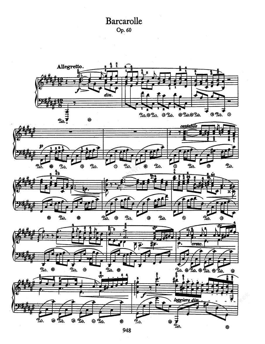升F大调船歌 Op.60 船歌 起源于意大利语中 Barca(船) 一词,据说由威尼斯船夫的传唱民歌演变而来,多为6/8或3/8拍,小船起伏荡漾的感觉在歌声中悠悠起伏。后来船歌泛指按这一体裁写成的声乐或器乐曲,比如门德尔松的《威尼斯船歌》,还有肖邦和福雷的《船歌》等。 《升F大调船歌》 in Major Op.60 ,作于1845-1846年,出版于1846年,呈献给斯托克豪森男爵夫人。肖邦只作了一首船歌,这是纯粹的威尼斯水乡著名的船夫之歌。典型的船歌是6/8拍子,其强拍在第一拍,弱拍在第四拍。肖邦则变为12/8拍,把强拍放在第一拍及第七拍,弱拍在第四拍及第十拍,并且将旋律线延长,使之更为流畅。 创作此曲乃肖邦与乔治·桑的感情即将破灭之前,肖邦自认为这是“坐在船上,只知道自己天地的一对恋人,表现情意绵绵的戏剧性。”乐曲充分反映了肖邦这一时期内心的孤独与悲愁。这首乐曲的构成,不论是从整体或者是从主题材料精密的发展,旋律或和声上的优雅等等,都称得上是肖邦最完美的杰出作品。这也是肖邦全部作品中最要求表现手法及用心来演奏的很难的乐曲之一。 乐曲一开始呈示的序奏主题采用三度、四度、五度、七度等音程的重奏,婉转悠长,蕴含着淡淡的伤感和忧愁。序奏主题之后出现两小节犹如荡浆的伴奏音型,接着,乐曲在这个伴奏音型的衬托下,轻轻地呈示出第一主题。这一主题起伏回荡,带有较强的歌唱性,仿佛诉说着忧伤的心事。这个主题反复两遍后,发展成为新的旋律,随后,在A大调上呈示出第二主题。这个主题旋律平静舒展,犹如绵绵的沉思,充满了宁静的气氛。这一主题经发展后情绪步步高涨并形成高潮。之后两个主题相继再现,最后用明确的终止式结束。