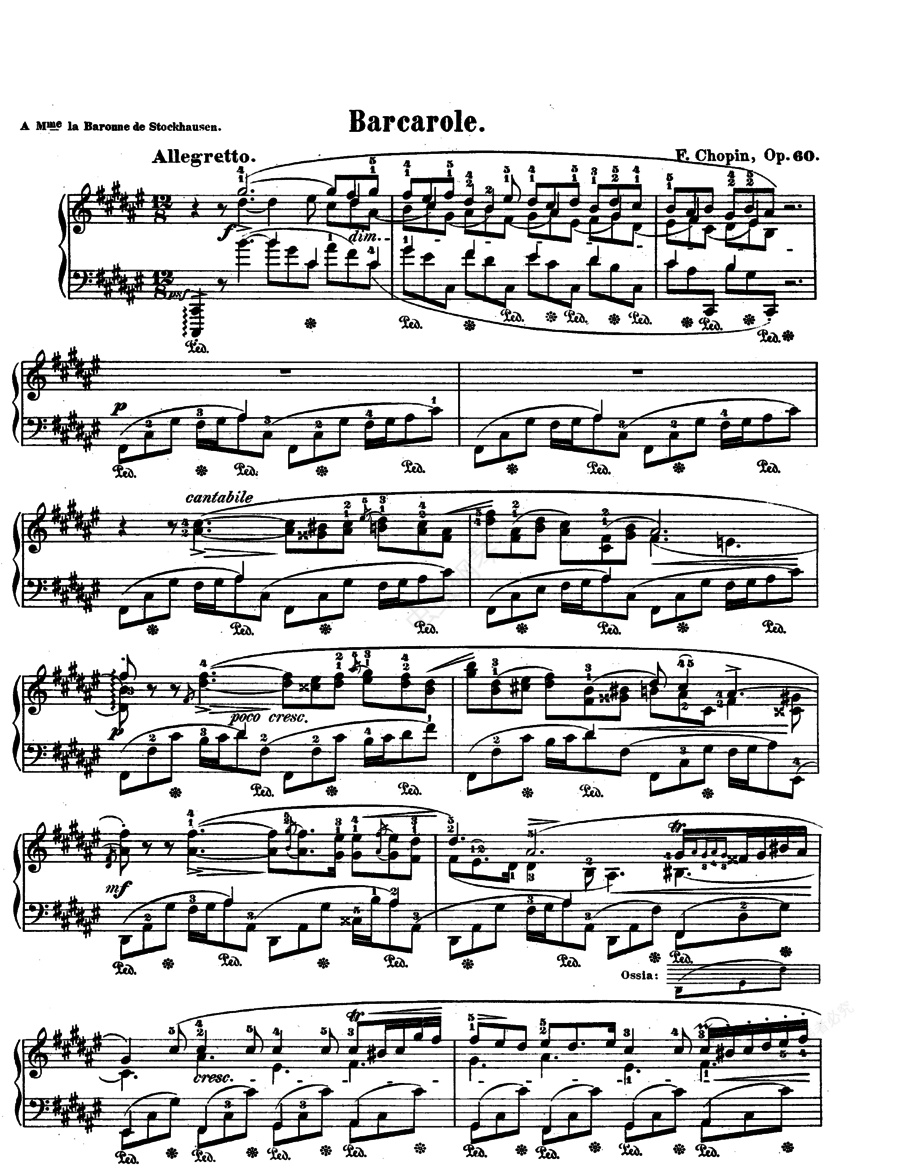 升F大调船歌 Op.60 船歌 起源于意大利语中 Barca(船) 一词,据说由威尼斯船夫的传唱民歌演变而来,多为6/8或3/8拍,小船起伏荡漾的感觉在歌声中悠悠起伏。后来船歌泛指按这一体裁写成的声乐或器乐曲,比如门德尔松的《威尼斯船歌》,还有肖邦和福雷的《船歌》等。 《升F大调船歌》 in Major Op.60 ,作于1845-1846年,出版于1846年,呈献给斯托克豪森男爵夫人。肖邦只作了一首船歌,这是纯粹的威尼斯水乡著名的船夫之歌。典型的船歌是6/8拍子,其强拍在第一拍,弱拍在第四拍。肖邦则变为12/8拍,把强拍放在第一拍及第七拍,弱拍在第四拍及第十拍,并且将旋律线延长,使之更为流畅。 创作此曲乃肖邦与乔治·桑的感情即将破灭之前,肖邦自认为这是“坐在船上,只知道自己天地的一对恋人,表现情意绵绵的戏剧性。”乐曲充分反映了肖邦这一时期内心的孤独与悲愁。这首乐曲的构成,不论是从整体或者是从主题材料精密的发展,旋律或和声上的优雅等等,都称得上是肖邦最完美的杰出作品。这也是肖邦全部作品中最要求表现手法及用心来演奏的很难的乐曲之一。 乐曲一开始呈示的序奏主题采用三度、四度、五度、七度等音程的重奏,婉转悠长,蕴含着淡淡的伤感和忧愁。序奏主题之后出现两小节犹如荡浆的伴奏音型,接着,乐曲在这个伴奏音型的衬托下,轻轻地呈示出第一主题。这一主题起伏回荡,带有较强的歌唱性,仿佛诉说着忧伤的心事。这个主题反复两遍后,发展成为新的旋律,随后,在A大调上呈示出第二主题。这个主题旋律平静舒展,犹如绵绵的沉思,充满了宁静的气氛。这一主题经发展后情绪步步高涨并形成高潮。之后两个主题相继再现,最后用明确的终止式结束。