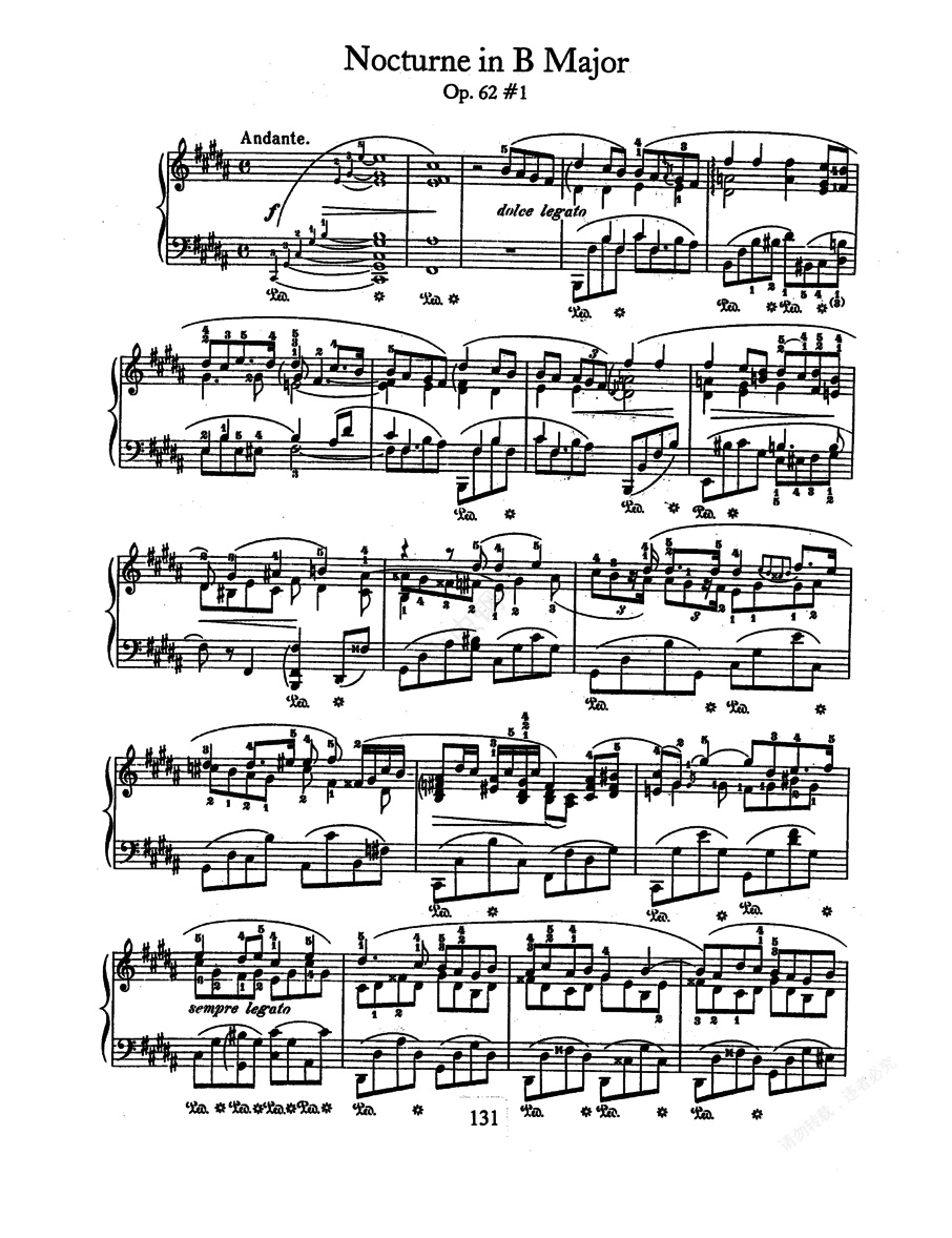 2首夜曲 Op.62 《两首夜曲》Deux Op.62 ,作于1846年,题献给肯迪利兹小姐。这是肖邦一生中最后的两首夜曲,我们在肖邦生命中最后的四首夜曲(Op.55 和 Op.62)中听到最美丽而安详的死亡之歌。 1. B大调夜曲 Op.62-1 ,4/4拍,行板,三部曲式。这是这两首夜曲中较为惹人喜欢的一首。哈涅卡解说:“这是在月光下飘散着花香的夜曲,带着疾病的、丰富的花香,那依着栅栏上升的音符突然转回主音,具有非常吸引人的魅力。主旋律非常华丽,充满了装饰音,还有很长的颤音段落,和声也非常雄厚。降A大调处踌躇不定,有很大的魅惑力。”这是一首带有病态香味的豪华风格的夜曲,形式虽不规则,但是它的抒情却能扣人心弦。 2. E大调夜曲 Op.62-2 ,4/4拍,慢板。卡拉索夫斯基说:“肖邦在去世前三年所作的这首夜曲,其经过洗练的和声及甜美的旋律,犹如梦幻一般”。其第一主题之后经间奏进入第二主题,安详而抒情的歌调发展成热情的朗诵,库拉克说:“这里有激烈的性格,高音部与低音部成激烈的敌对式的对话,采取反复进行的方式处理,这首夜曲比同类作品中的任何一首旋律及和声部分都要丰富”。