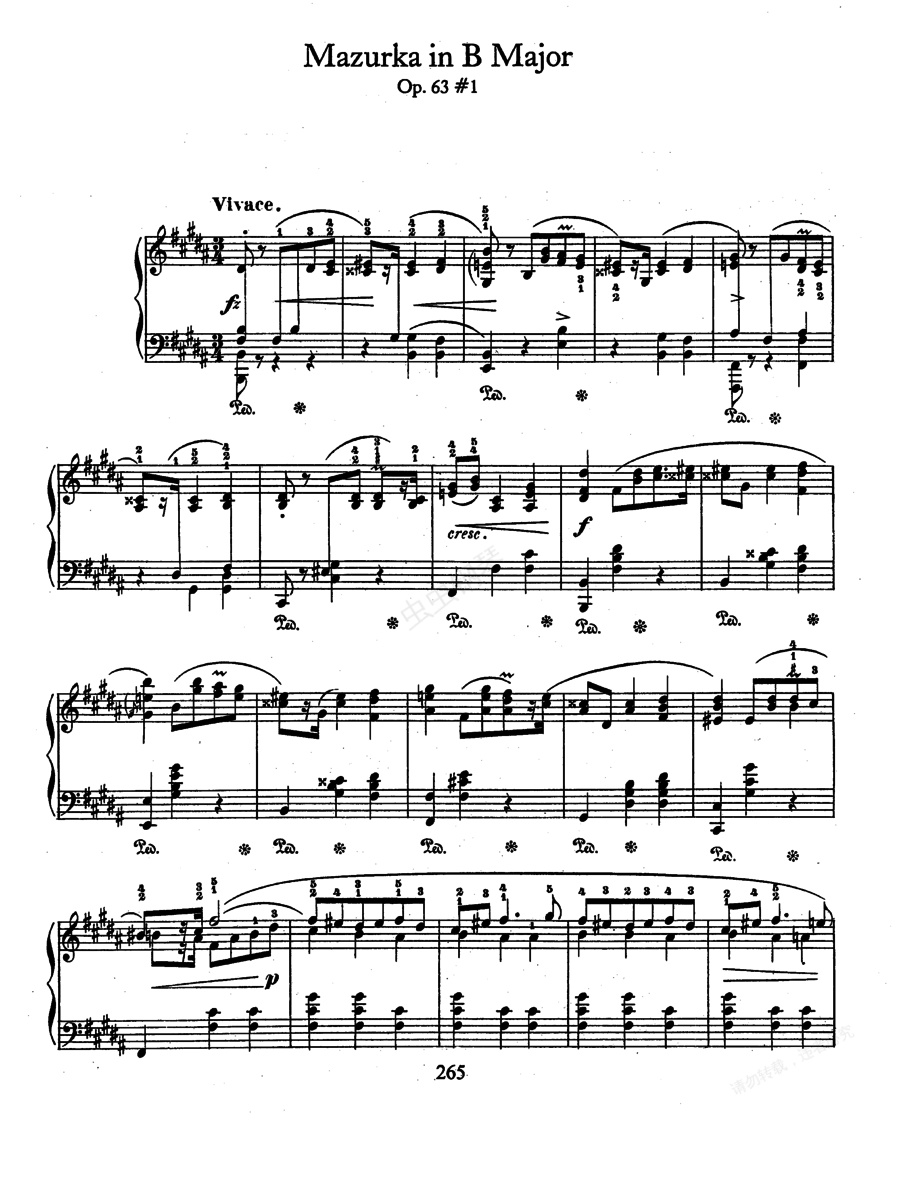 3首玛祖卡舞曲 Op.63 《三首玛祖卡舞曲》Trois Op.63 ,是肖邦生前最后出版的玛祖卡舞曲。作于1846年,出版于1847年,呈献给佐斯特夫斯卡伯爵夫人。 1. B大调玛祖卡舞曲 Op.63-1 ,活泼地,三部曲式:①A、B(B大调)、C(B大调),②B、D(A大调,B大调),③重复A,尾声。这是三首中最为泼辣的,充满了魅力。哈涅卡说这首作品:“充满了生命感”。 2. f小调玛祖卡舞曲 Op.63-2 ,慢板,三部曲式,中段转入降A大调。这是一首短小的平易近人的舞曲,乐曲中充满了哀伤的情绪。 3. 升c小调玛祖卡舞曲 Op.63-3 ,小快板,三部曲式:①A、B(升c小调),②B、C(降D大调),③重复第一段,尾声。这是一首哀艳绝美的玛祖卡舞曲,在尾声中有非常优异的卡农。如此完整的八度卡农绝非一般精于此道者所能写出。