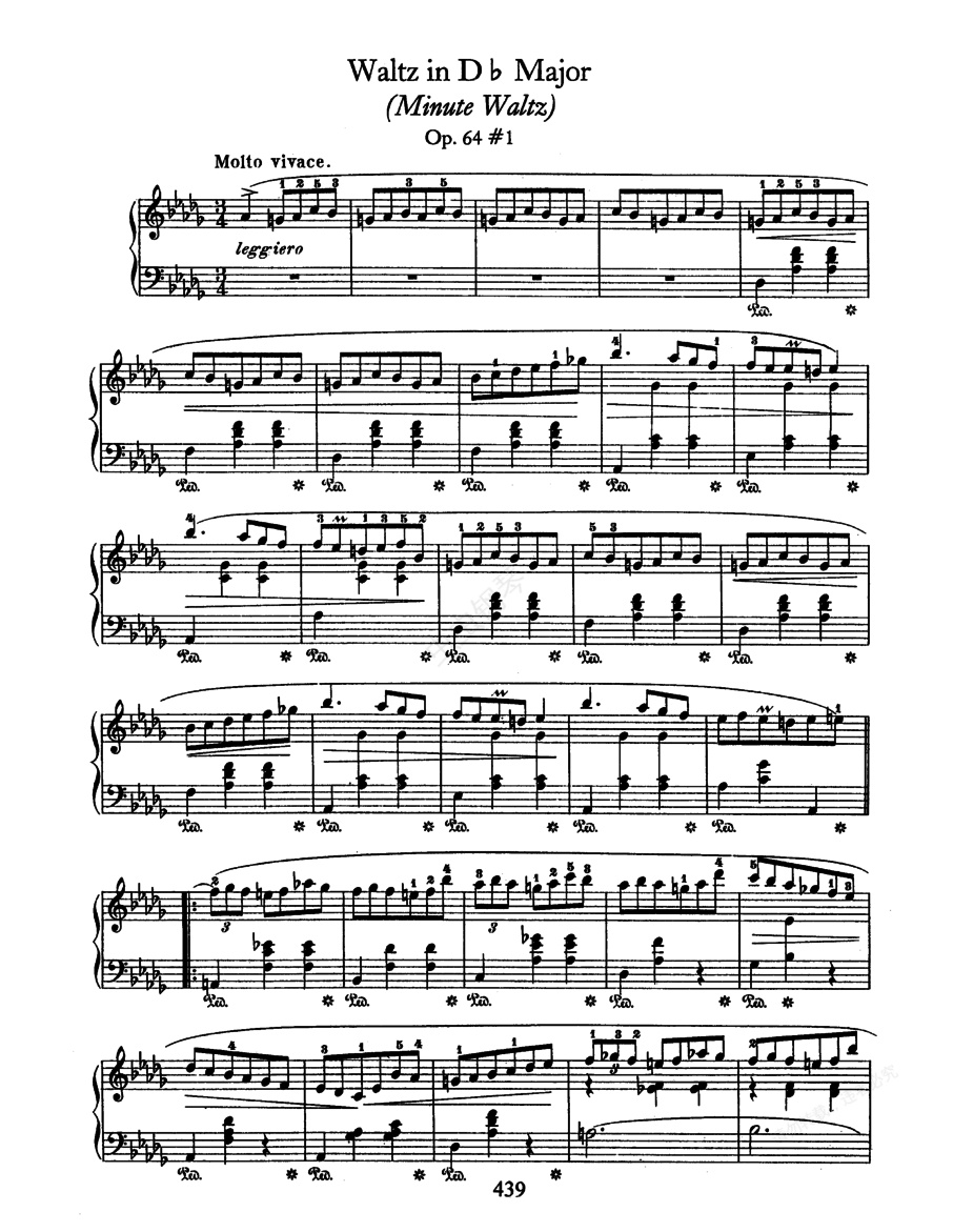 3首圆舞曲 Op.64 《三首圆舞曲》Trois Op.64 ,作于1846-1847年,是肖邦在世时出版的最后的圆舞曲。 1. 降D大调圆舞曲“小狗”Op.64-1 ,又名“一分钟圆舞曲” Waltz ,非常活泼和连贯的,呈献给德费努彼特卡伯爵夫人。肖邦的朋友乔治•桑养着一只小狗,它经常喜欢追逐自己的尾巴团团转。肖邦应乔治•桑要求,把小狗的这个可爱的动态用音乐表现出来,于是写成此曲。乐谱的篇幅短小,速度迅急,一气呵成。四小节的引子之后,在圆舞曲节奏的伴奏下呈示带有旋转感的主题。这一旋转的旋律线不断反复,淋漓尽致地表现了调皮的小狗团团旋转的动态。接着,乐曲出现了甜美徐缓的中间部主题,轻松而悠闲,与第一段的速度形成对比。最后再现旋转不停的开头部分。 2. 升c小调圆舞曲 Op.64-2 ,呈献给罗斯吉德男爵夫人。这是肖邦在去世前两年创作的,具有浓郁的民族性,其节奏近似玛祖卡舞曲,是一首典型的圆舞曲抒情诗。乐曲用三段体构成,第一段主旋律含有悲叹的成分,接着是急速的运动,它不是以往那种华丽的性格,而是软弱的没有生气的旋律。中段转为降D大调,情绪明朗了一些,但是很快又出现忧郁的气氛。在回旋运动之后,反复开始时的主旋律,乐曲在焦躁不安中终结。 3. 降A大调圆舞曲 Op.64-3 ,中板,呈献给布·布拉尼卡伯爵夫人。与Op.64-2的阴郁相比,此曲充满了明朗喜悦及祝福,旋律非常优美。三段体,第一段旋律由降A大调转降E大调、降B大调、降G大调、C大调;中段由C大调转为G大调、d小调、C大调、f小调、降G大调,再转为降A大调;第三段是第一段的再现,最后是短小的尾声。在肖邦的圆舞曲中是术语少见的多样性调性构成的乐曲。