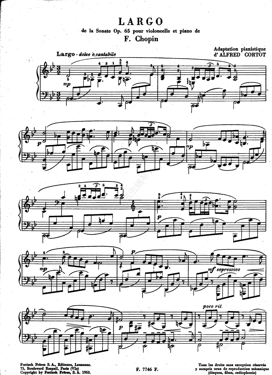 g小调大提琴奏鸣曲 Op.65 《g小调大提琴奏鸣曲》 for Cello and Piano in g Minor Op.65 ,作于1846年,于1847年出版,也是肖邦生前最后发表的作品。这部为大提琴与钢琴而作的奏鸣曲与其他的晚期作品显然不同。在几乎与大提琴奏鸣曲同时写成的船歌和幻想波洛涅兹舞曲里,我们看到的是精致优美的音乐形象、纤巧秀丽的钢琴写法,同时又洋溢着无穷的诗意。在这首奏鸣曲中,我们可以看到作曲家对这两种乐器的创作手法都掌握得极为娴熟了,以往室内乐作品中钢琴压倒大提琴的情况已经没有了。其风格严谨纯朴、庄重高尚,感情平稳。最优秀的是第一乐章和谐谑曲乐章,首乐章主部主题非常动人,而谐谑曲乐章则充满了活力。广板乐章和末乐章写的不太成功,其主题材料不太鲜明,而且缺乏肖邦的特色。 第一乐章,中速的快板,g小调,4/4拍。 第二乐章,谐谑曲,精神抖擞的快板,d小调,3/4拍。 第三乐章,广板,降B大调,3/2拍。 第四乐章,终曲,快板,g小调,2/2拍。
