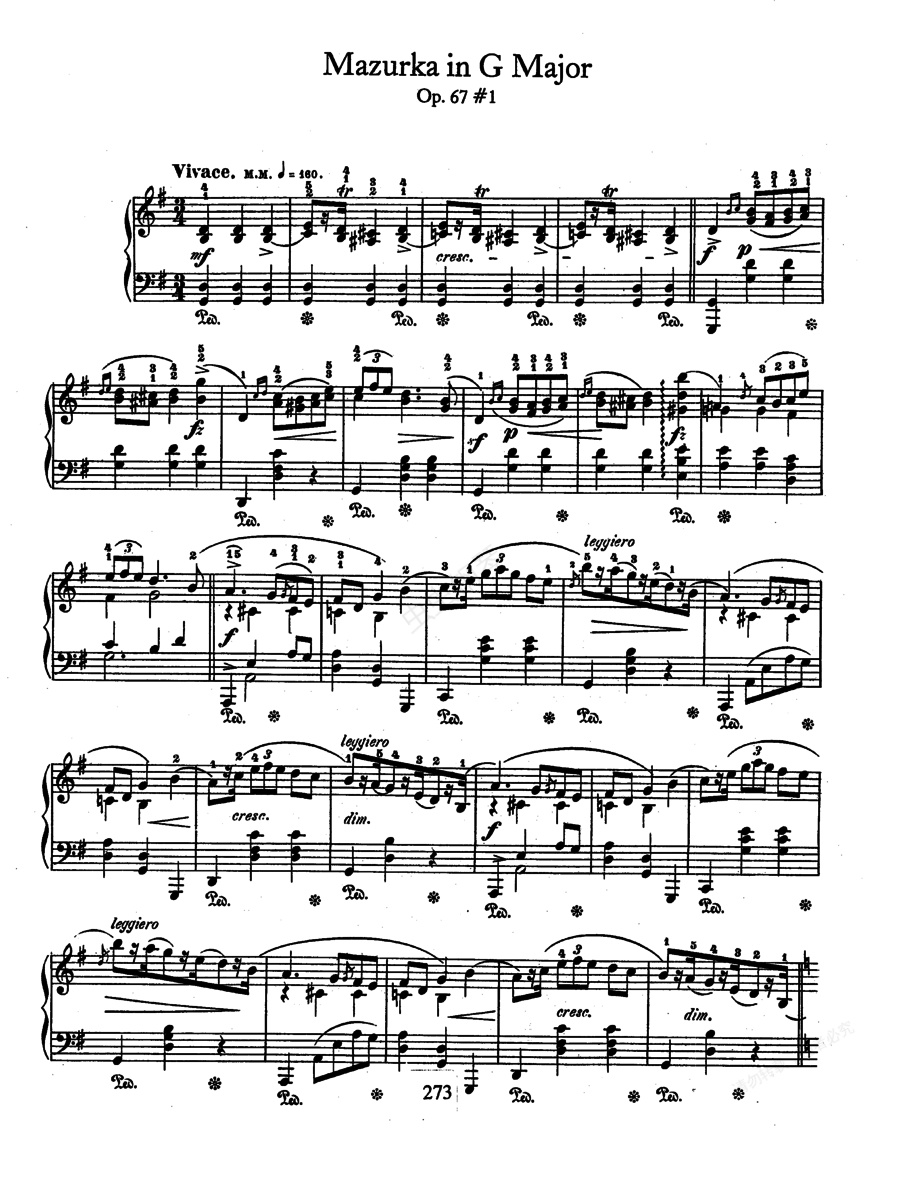 4首玛祖卡舞曲 Op.67 编号为Op.67 和Op.68 的两个曲集均为肖邦死后以遗作方式编辑出版的玛祖卡舞曲。这些作品被普遍认为不是肖邦玛祖卡舞曲中的杰作。从肖邦生前无心发表这些作品来看,他自己的心目中也没有把它们当作上乘的作品。但是经过时间的推移,人们对这些作品也有了进一步的认识,其中不乏优秀之作。 《四首玛祖卡舞曲》 Op.67 ,遗作,于1855年出版。 1. G大调玛祖卡舞曲 Op.67-1 ,作于1835年,活泼的。这首玛祖卡的情绪相当愉快,用三部曲式写成:①序奏,A、B(D大调);②C(C大凋);③重复A、B。 2. g小调玛祖卡舞曲 Op.67-2 ,作于1849年,如歌的。这是一首简单、朴素、优美的乐曲,三部曲式。 3. C大调玛祖卡舞曲 Op.67-3 ,作于1835年,小快板。这是肖邦青年时期的作品,在内容方面被认为是没有特色的,是适用于舞蹈用的作品。三部曲式,中段转G大调。 4. a小调玛祖卡舞曲 Op.67-4 ,作于1846年,生动的中板。这首玛祖卡舞曲不但是该组作品中最优秀的,也是肖邦玛祖卡舞曲中最著名的作品之一。它的旋律非常优美,三部曲式。
