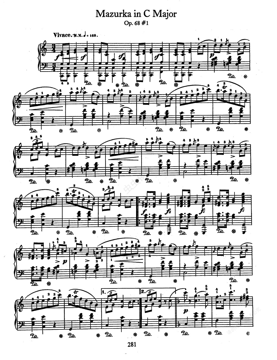 4首玛祖卡舞曲 Op.68 《四首玛祖卡舞曲》 Op.68 ,遗作,于1855年出版。其中前三首为肖邦17-20岁时的作品,最后一首是肖邦去世前的绝笔。 1. C大调玛祖卡舞曲 Op.68-1 ,作于1830年,活泼的。属未成熟时期的创作,是极为简朴的一首作品,三部曲式。中段转F大调。 2. a小调玛祖卡舞曲 Op.68-2 ,作于1827年,慢板。这是肖邦17岁时的作品,尼克斯评价:“本曲虽然单纯、粗犷,同时又很优雅。曲中最具独创性的中断速度转快部分,在他的晚期的玛祖卡中又以变形姿态再次出现,这意味着在他的初期作品中,已经对未来的美感有了先兆。” 3. F大调玛祖卡舞曲 Op.68-3 ,作于1830年,不过分的快板。也是极为简朴的一首作品,利地亚调式,三部曲式。中段转降B大调。哈涅卡评价:“印象单薄,没有价值的作品。” 4. f小调玛祖卡舞曲 Op.68-4 ,作于1849年,小行板。这是肖邦生前所作的最后一首作品,三部曲式:①f小调转A大调再转回f小调;②降A大调,有经过的转调;③重复第一段。乐曲的编辑者冯达纳对此曲曾有如下的注释:“这首玛祖卡舞曲是肖邦去世前,依最后的灵感执笔写成。当时由于大师已病入膏肓,无法自己用钢琴弹奏而终了。”卡拉索夫斯基评说:“这首乐曲就如同巨匠最后的时日那么地悲哀,是非常伤感的作品。他在这首‘天鹅之歌’中,证明了自己依然憧憬少年时代在故乡幸福的情景,那种最后瞬间的创作灵感,忠实于故乡的音乐,为祖国而创作。”