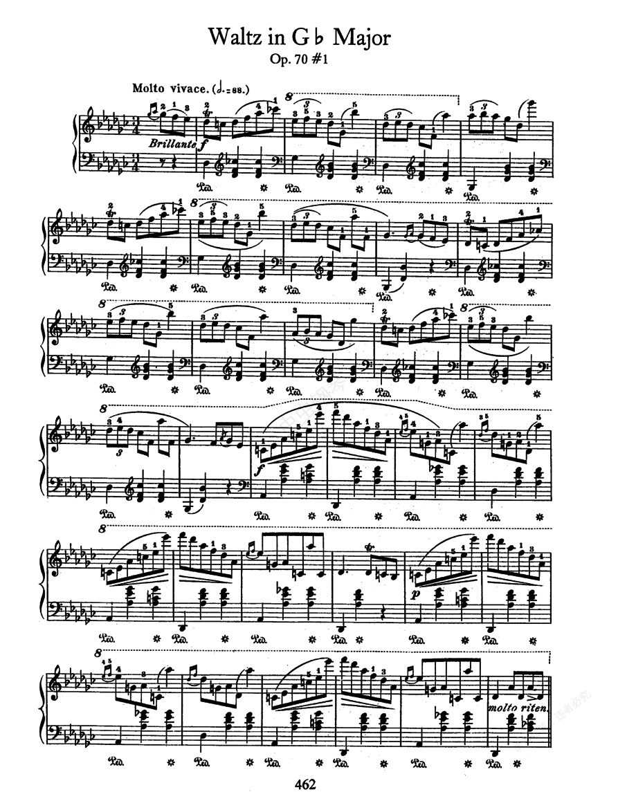 3首圆舞曲 Op.70 《三首圆舞曲》Trois Op.70 ,遗作,于1855年出版。 1. 降G大调圆舞曲 Op.70-1 ,约作于1835年,非常活泼的。这是一首演奏技巧相当难的华丽的小品,采用三部曲式,第一段为跳跃似的音型,非常迷人,由降G大调转为降D大调,中段为优雅的旋律。 2. f小调圆舞曲 Op.70-2 ,约作于1841年,适中的速度。其旋律非常优美,其中充满了伤感。乐曲的构成较为单纯、形式简洁,为AB两段体。 3. 降D大调圆舞曲 Op.70-3 ,约作于1829年,中板。肖邦在给好友沃吉克夫斯基的信上曾注明,此曲是为思念初恋情人康斯坦蒂亚•格拉德科芙斯卡()而作,充满了憧憬青春的甜蜜。三部曲式,第一段由两个旋律构成,中段也有两个旋律,其中一个为降G大调。中段的第五小节低音部旋律用到了降E音,表示对康斯坦蒂亚的思恋。