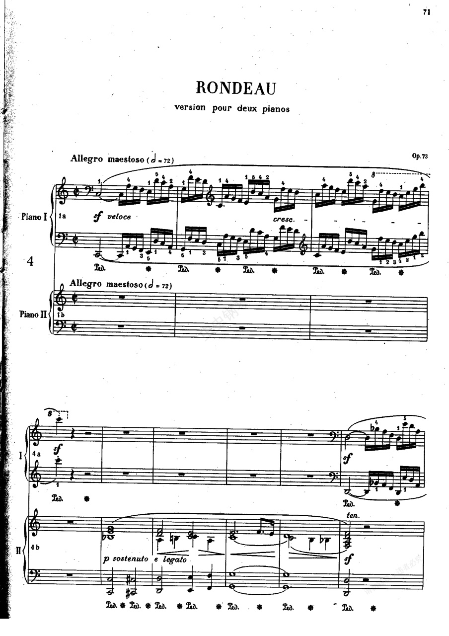C大调双钢琴回旋曲 Op.73    《C大调双钢琴回旋曲》Rondo in C Major For Two Op.73 ,遗作,于1855年出版。这首作品最初是为一架钢琴而作,约作于1825-1826年间,由于肖邦本人对其十分不满意,因此它一直被“藏起”,直到1828年,肖邦才将其改写成双钢琴形式。它纯属肖邦初期的习作,为含两个插句的回旋曲,结构为:序奏-A-B-A-B-A-尾奏,C大调,2/4拍,庄严的快板。主题带有田园诗般的、诙谐的性格。
