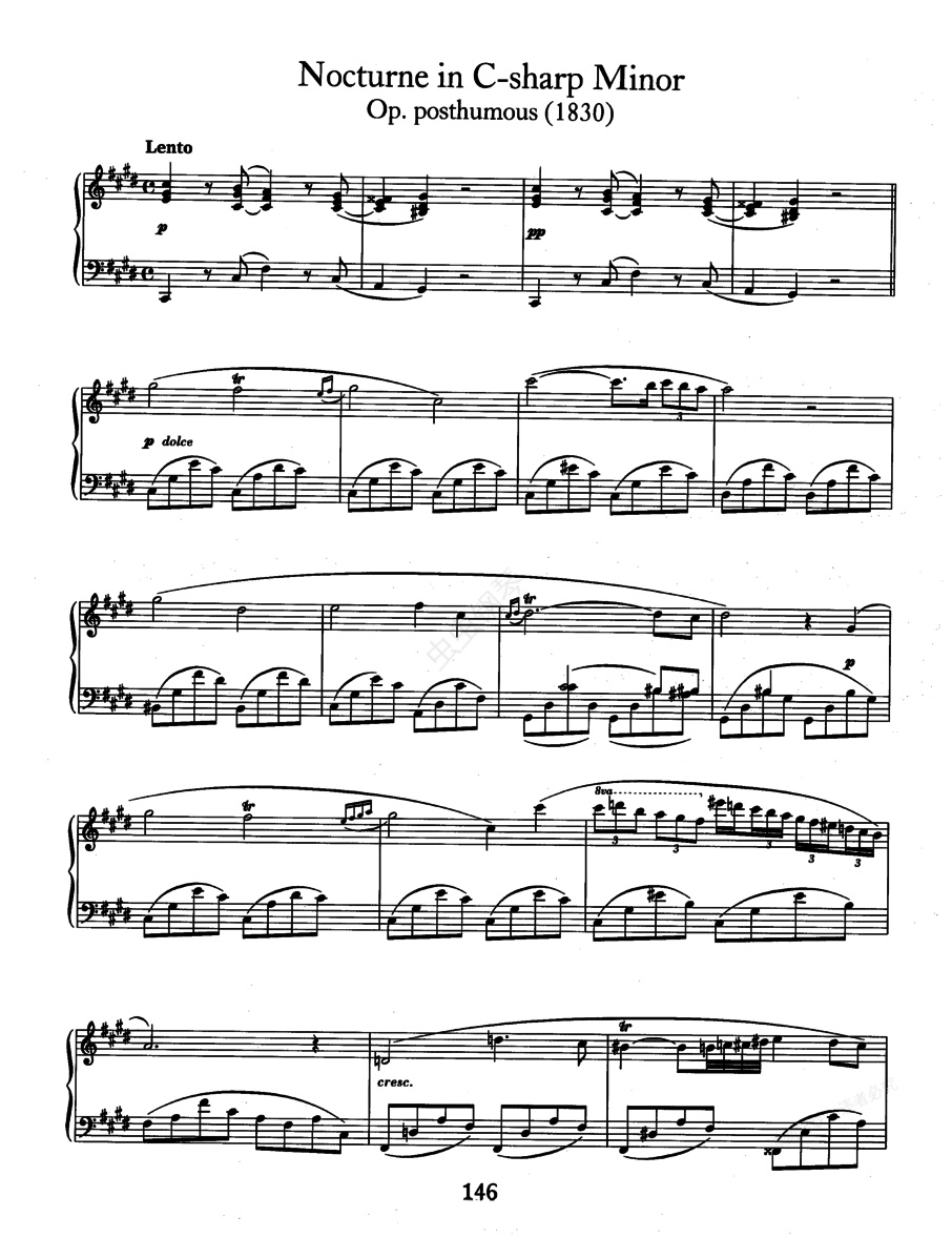升c小调夜曲(遗作) 《升c小调夜曲》 in Minor ,遗作,于1875年出版,为肖邦第二十首夜曲。作品约作于1830年,肖邦原来并未构思为夜曲,而仅标以“极有表情的慢板”Lento con gran 字样。此曲的受赠人是肖邦的姐姐鲁德维卡()。鲁德维卡在肖邦死后把他未经出版的作品编辑了一个目录,她在这首作品的题名下标以“夜曲风格的慢板”Leto w 字样。因此这首作品就被认为应归属于夜曲。 这首作品为升c小调,4/4拍,极有表情的慢板。其独特之处在于肖邦在这里从他的《f小调第二钢琴协奏曲》Op.21 及歌曲《少女的愿望》中引用了一些乐思。这些引用与乐曲的织体编织在一起是如此的富于技巧,以致于它们一点也没有脱离同出一源的性质和忧郁的美。 近年此曲更为人熟知,在于它被用作电影《钢琴师》中的插曲,影片中的男主角,波兰犹太钢琴演奏家斯皮尔曼在波兰电台录音时伴着窗外的炮火声和楼房的摇晃弹奏的就是肖邦的这首《升c小调夜曲》,然而炮火最终将钢琴声打断。五年过去了,战后斯皮尔曼回到波兰电台,他弹奏的第一首曲子还是这首《升c小调夜曲》,就像斯皮尔曼在他的回忆录中写的那样:“五年的时间,对于这首《升c小调夜曲》来说,似乎只是一个短暂的休止,它好像只是被稍稍地打扰了一下”。